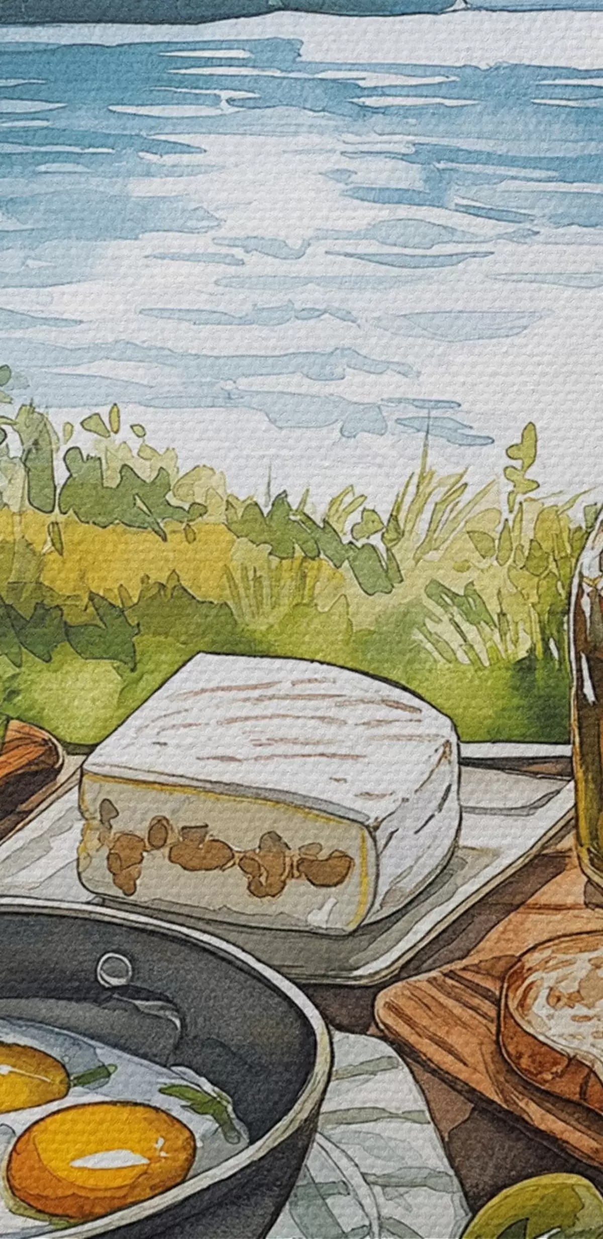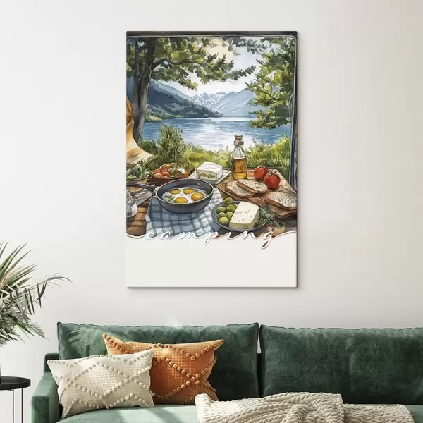 Glezna Kempinga estētika, akvareļu stils, vasaras ezers, daba, pārtika s42428
