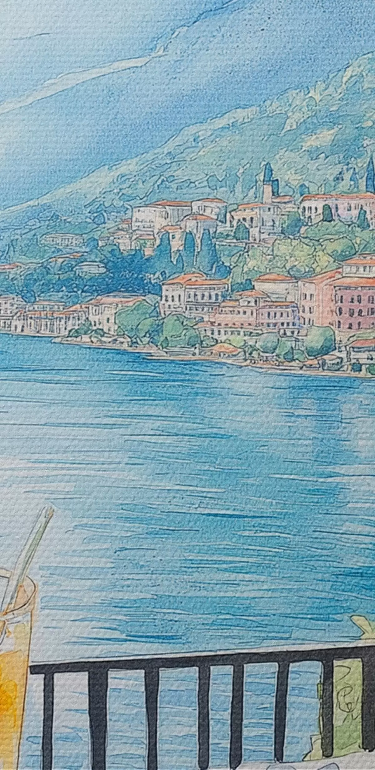 Glezna Vēlās brokastis Itālijā, akvareļu stilā, pica margarita, ezers, vasaras daba Nr s42436