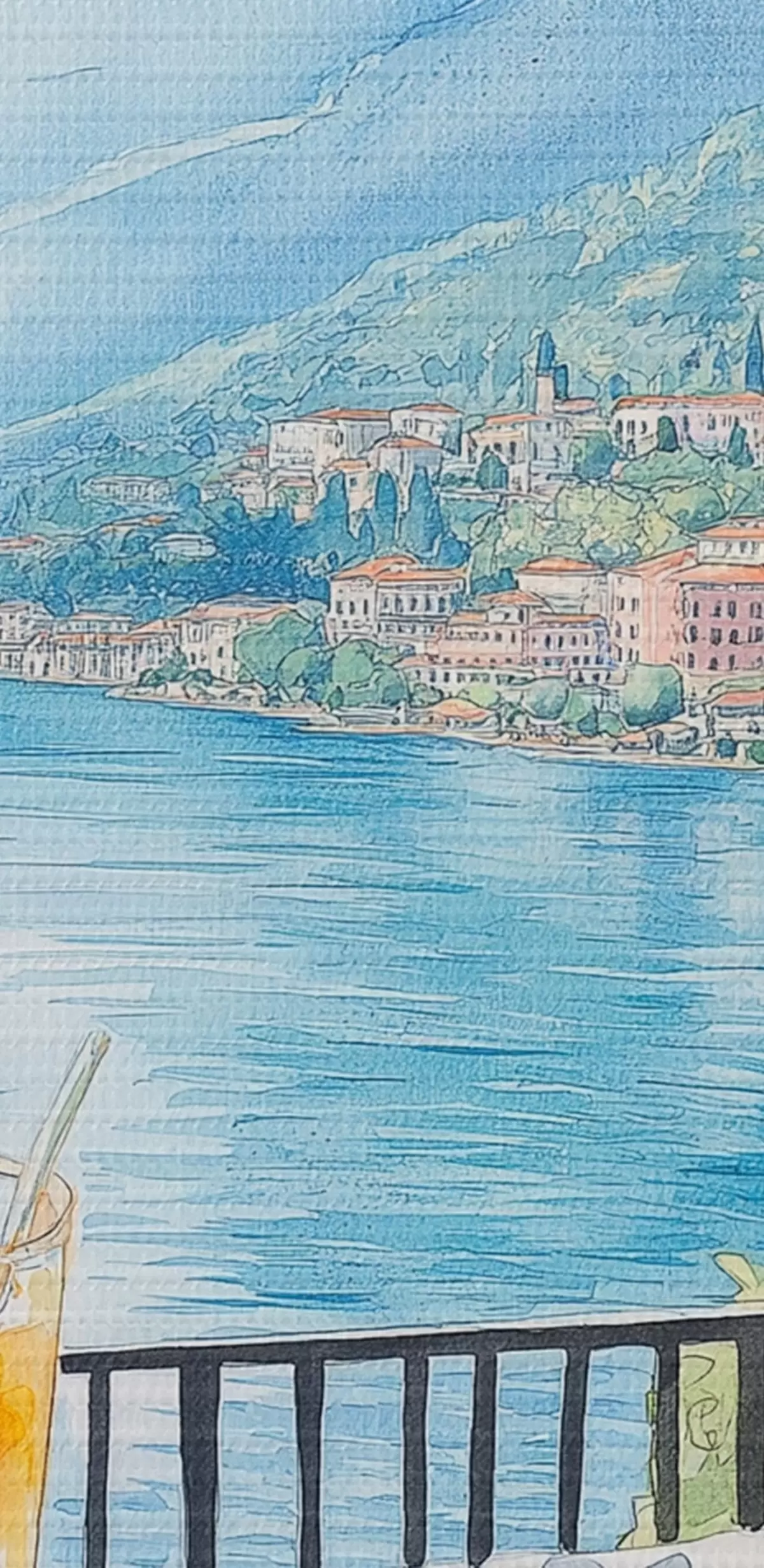 Glezna Vēlās brokastis Itālijā, akvareļu stilā, pica margarita, ezers, vasaras daba s42436