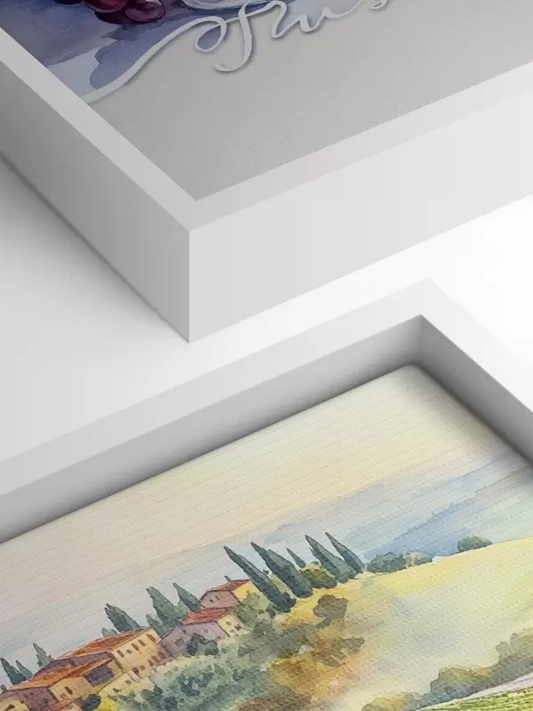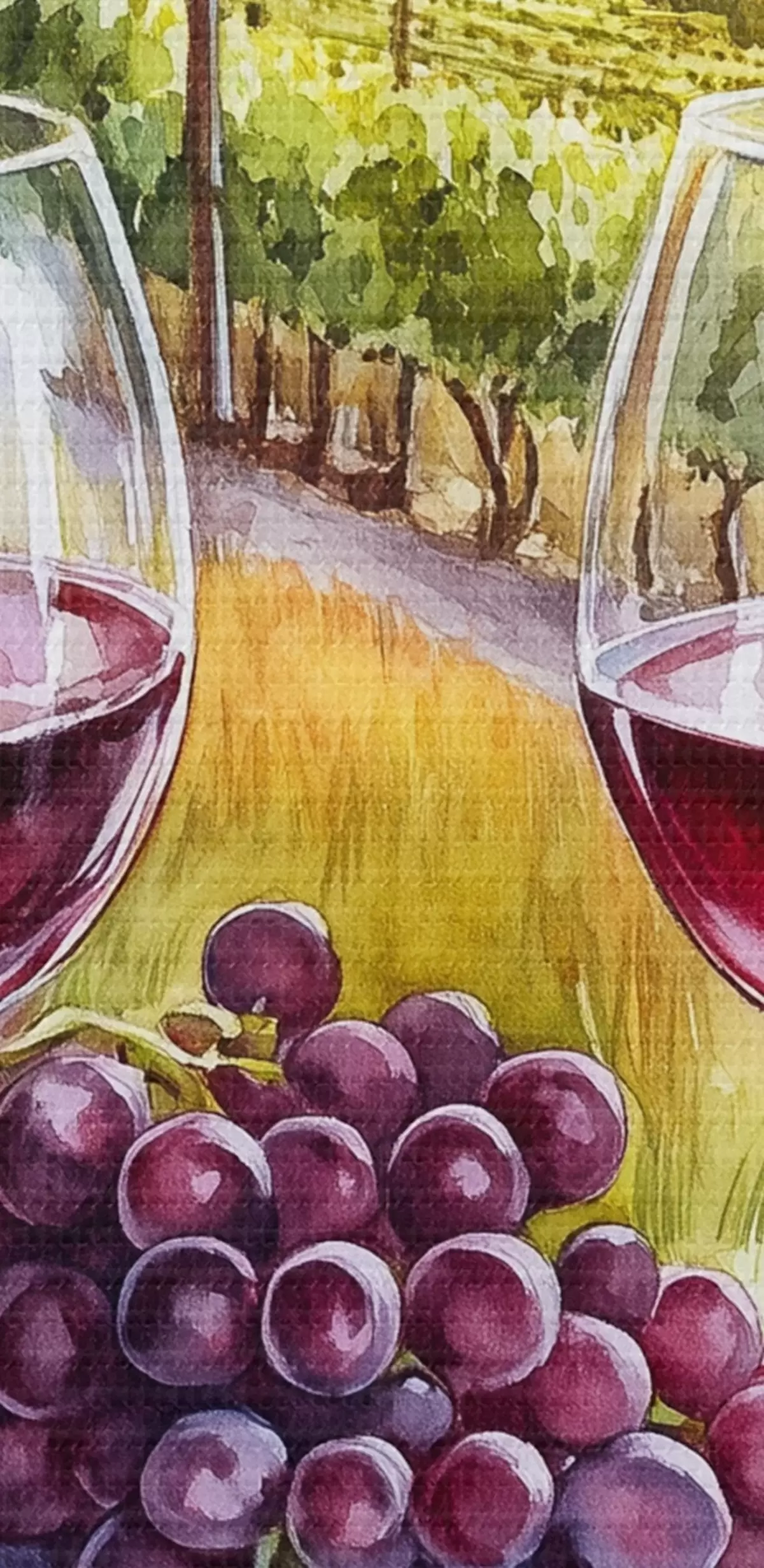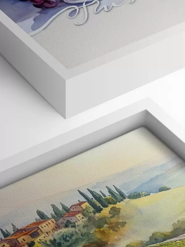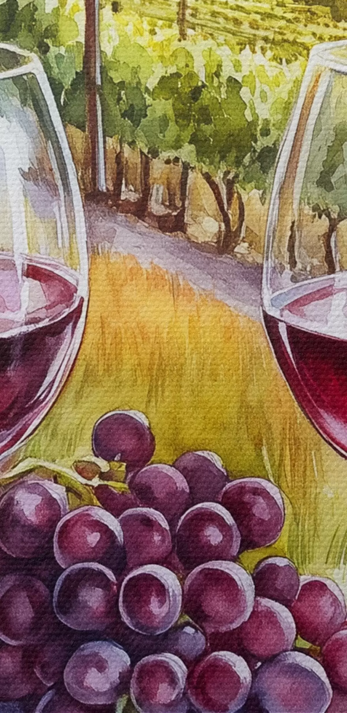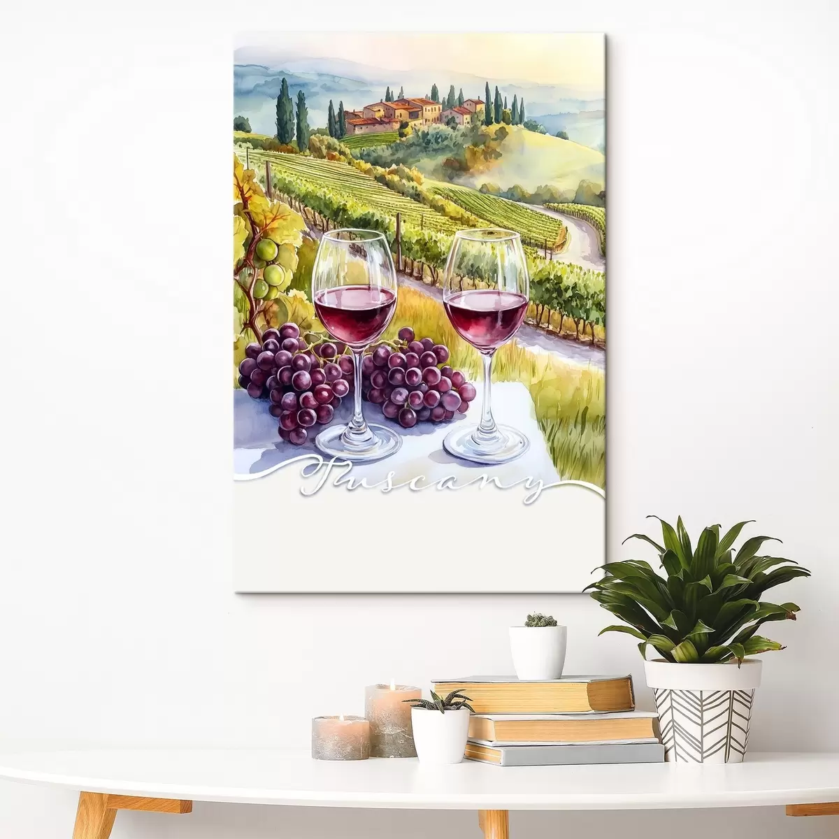 Glezna Toskānas ainavas, akvareļu stilā, vīna glāzes, vīnogas, saulriets s42439