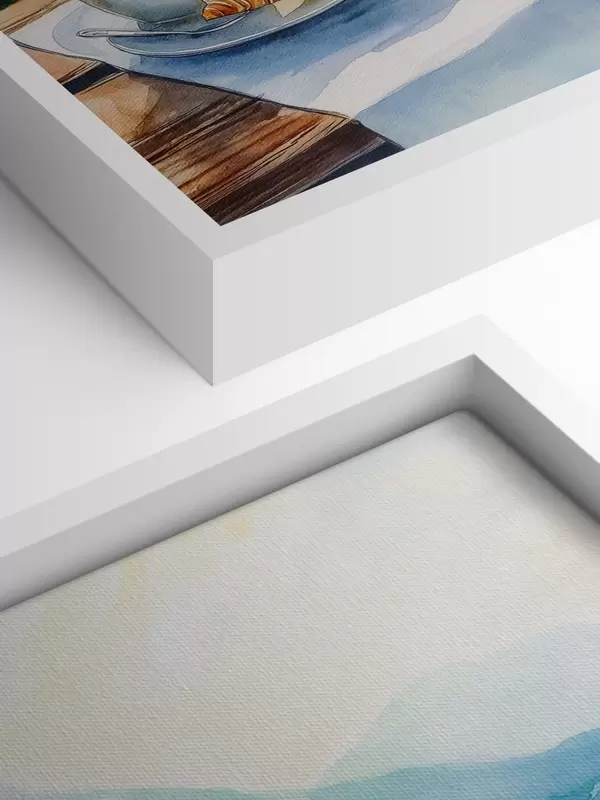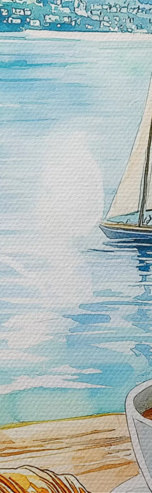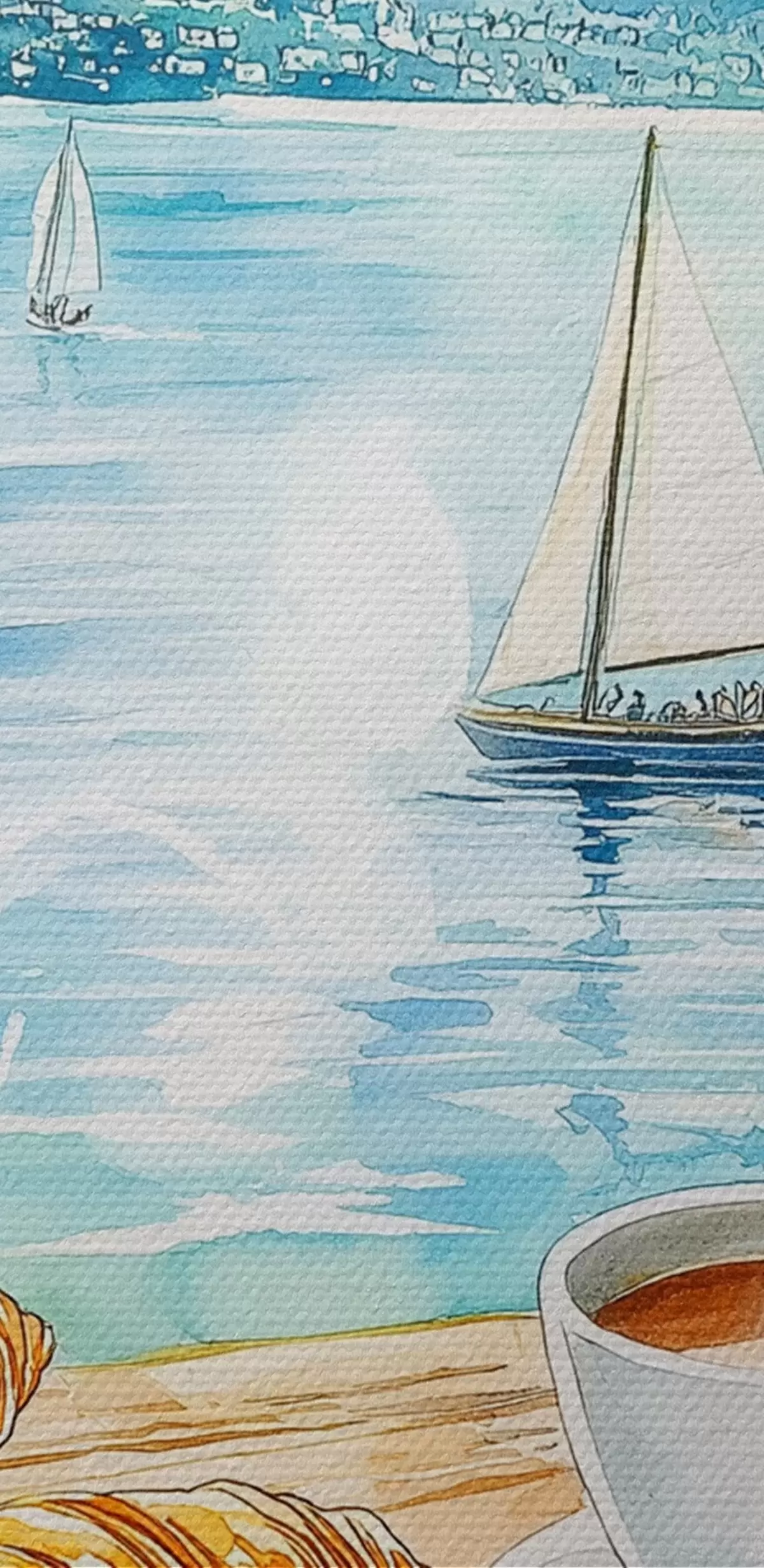 Glezna Vasaras ezers ar buru laivām, kafijas tasēm, kruasāniem, akvareļu stilā Nr s42441