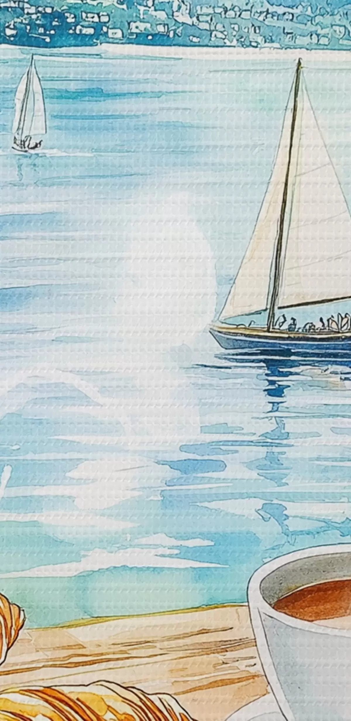Glezna Vasaras ezers ar buru laivām, kafijas tasēm, kruasāniem, akvareļu stilā s42441