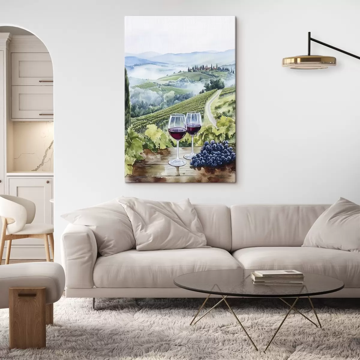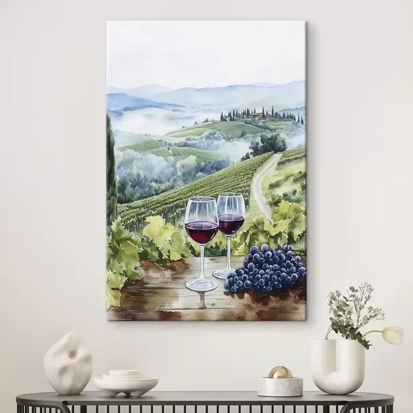 Glezna Toskānas ainava, vīnogu pagalmi, vīna glāzes, akvareļu stilā Nr s42445