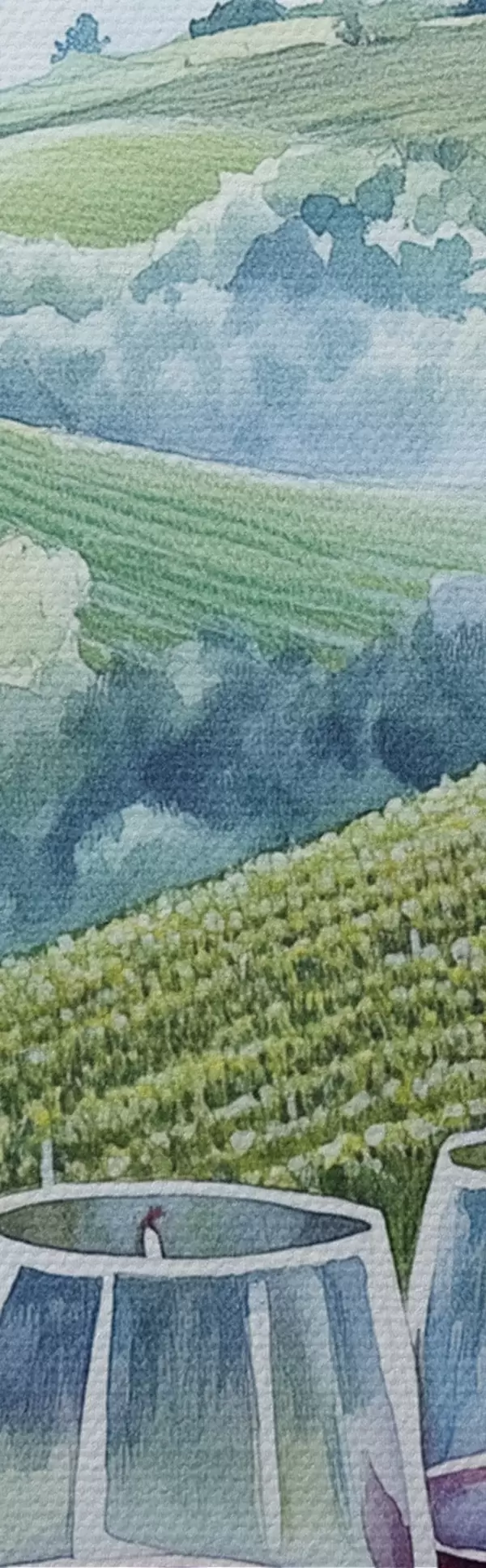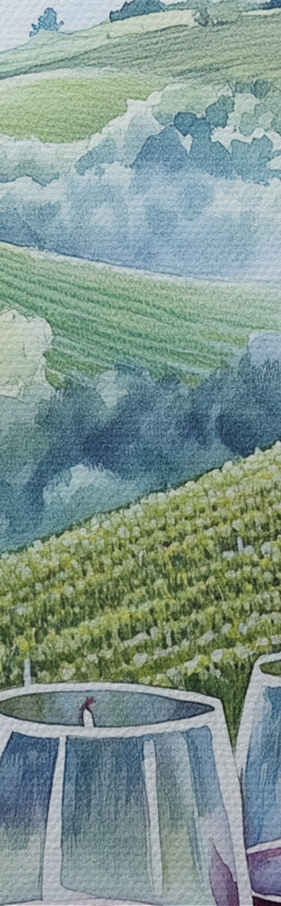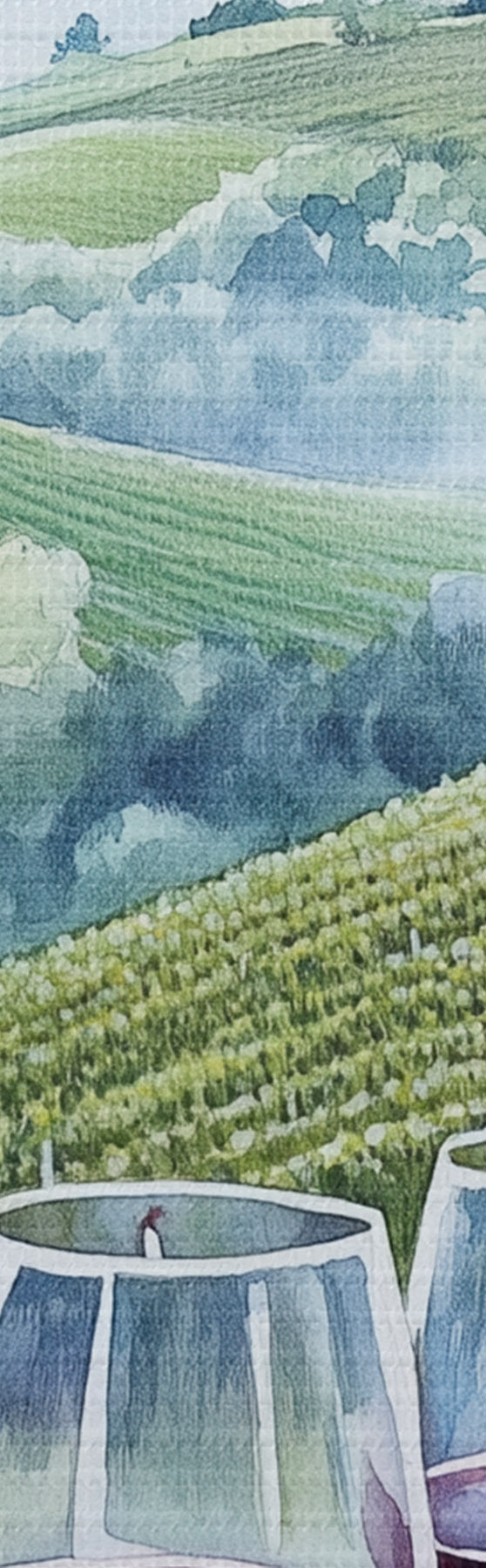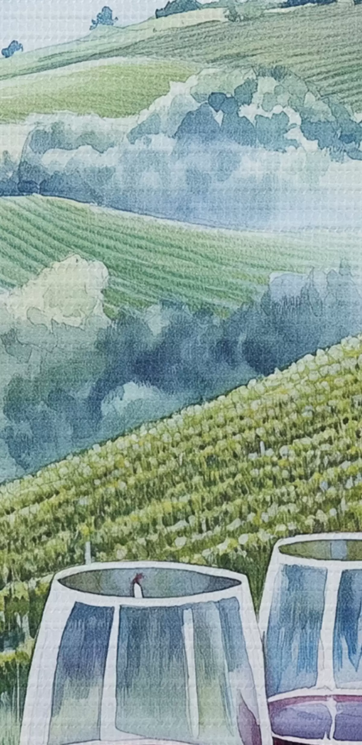 Glezna Toskānas ainava, vīnogu pagalmi, vīna glāzes, akvareļu stilā s42445
