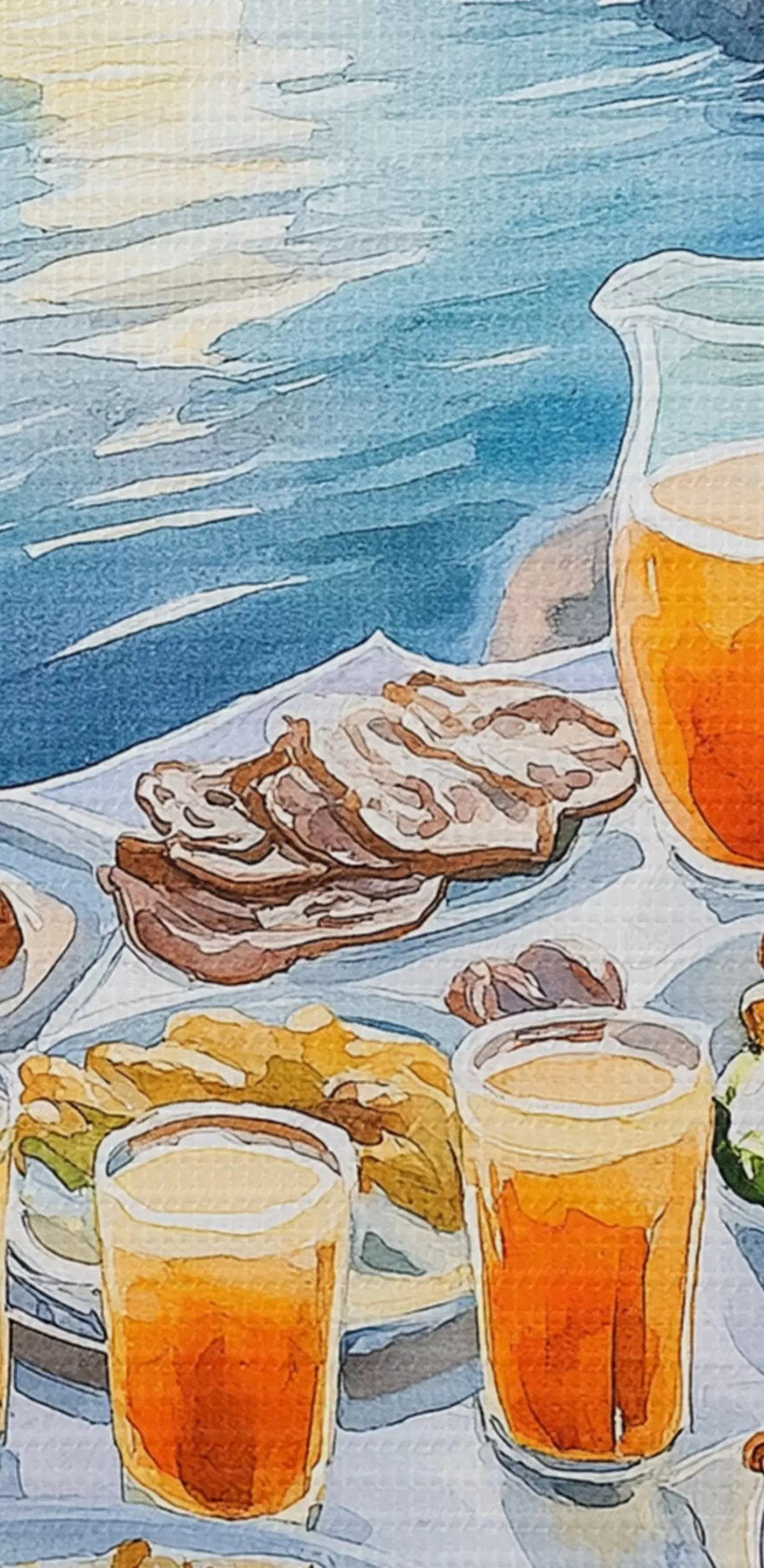 Glezna Romantiska atpūta Grieķijā, akvareļu stilā, brokastis, saullēkts s42453