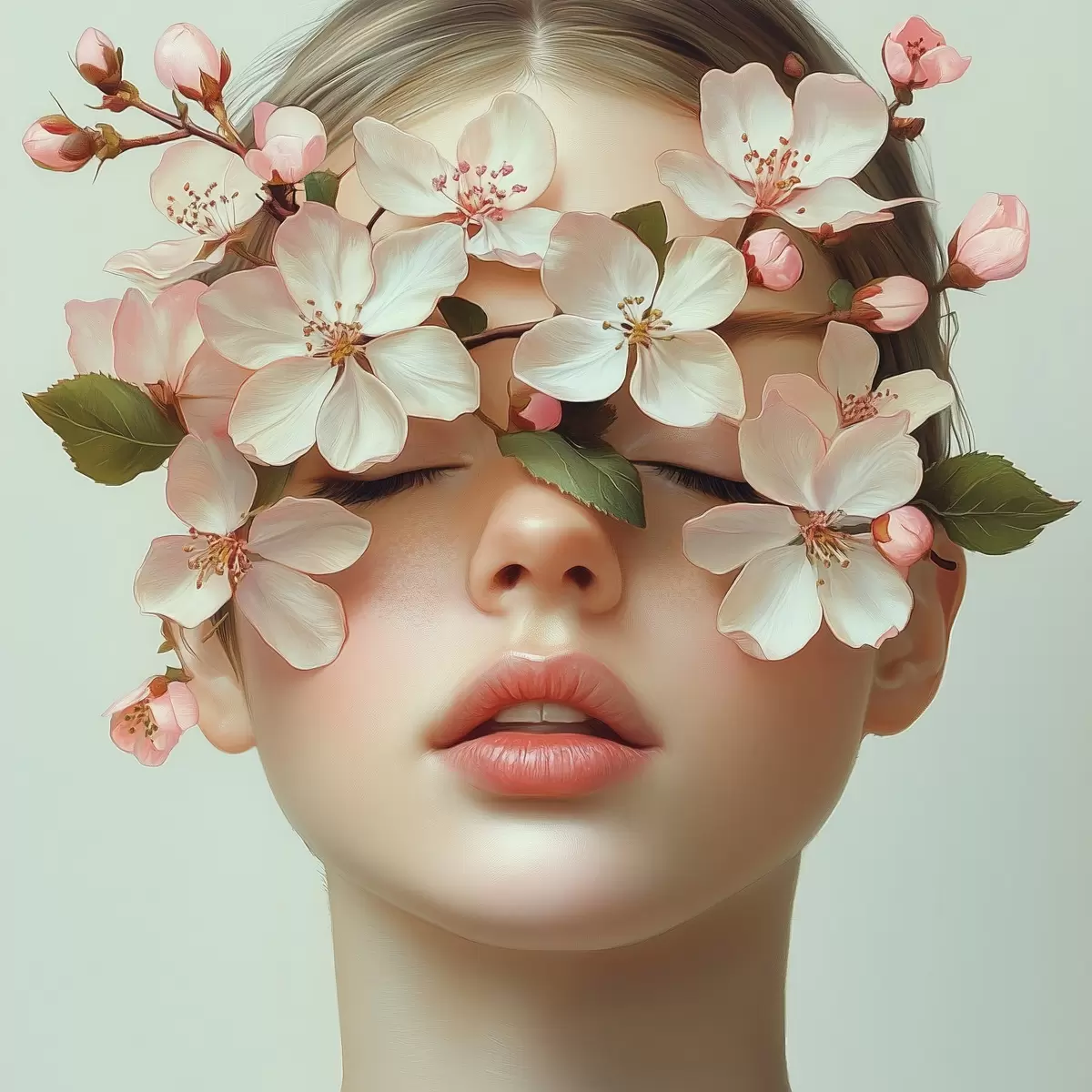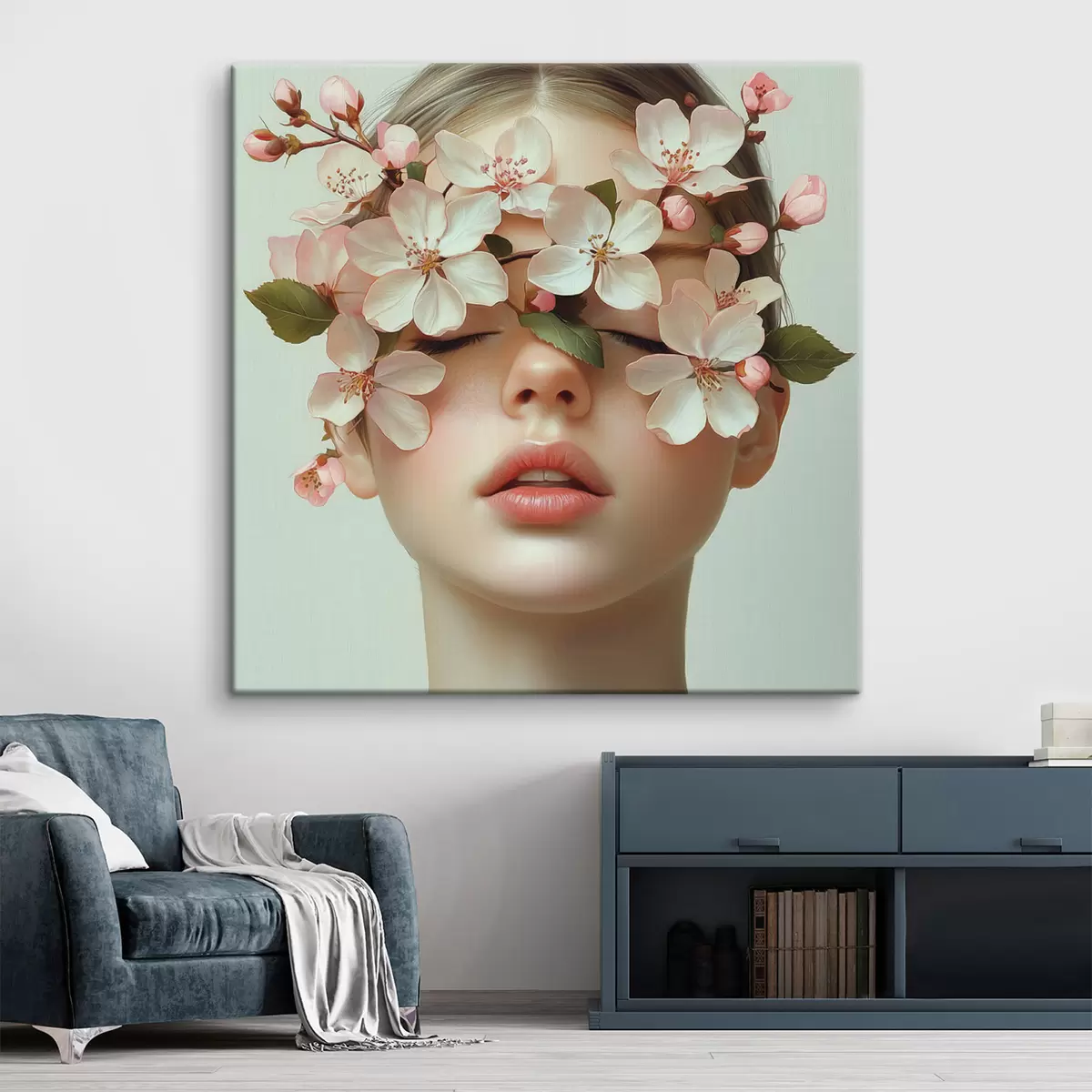 Glezna Meitenes portrets ar ziediem uz sejas s42506
