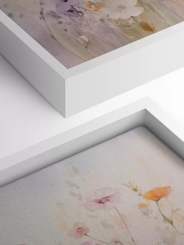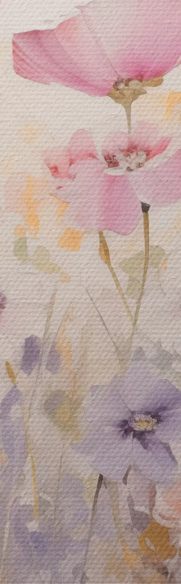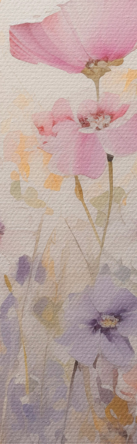 Glezna Pļava ar akvareļu ziediem maigos rozā, violetos un baltos toņos, kas rada viegluma un harmonijas atmosfēru. s42557