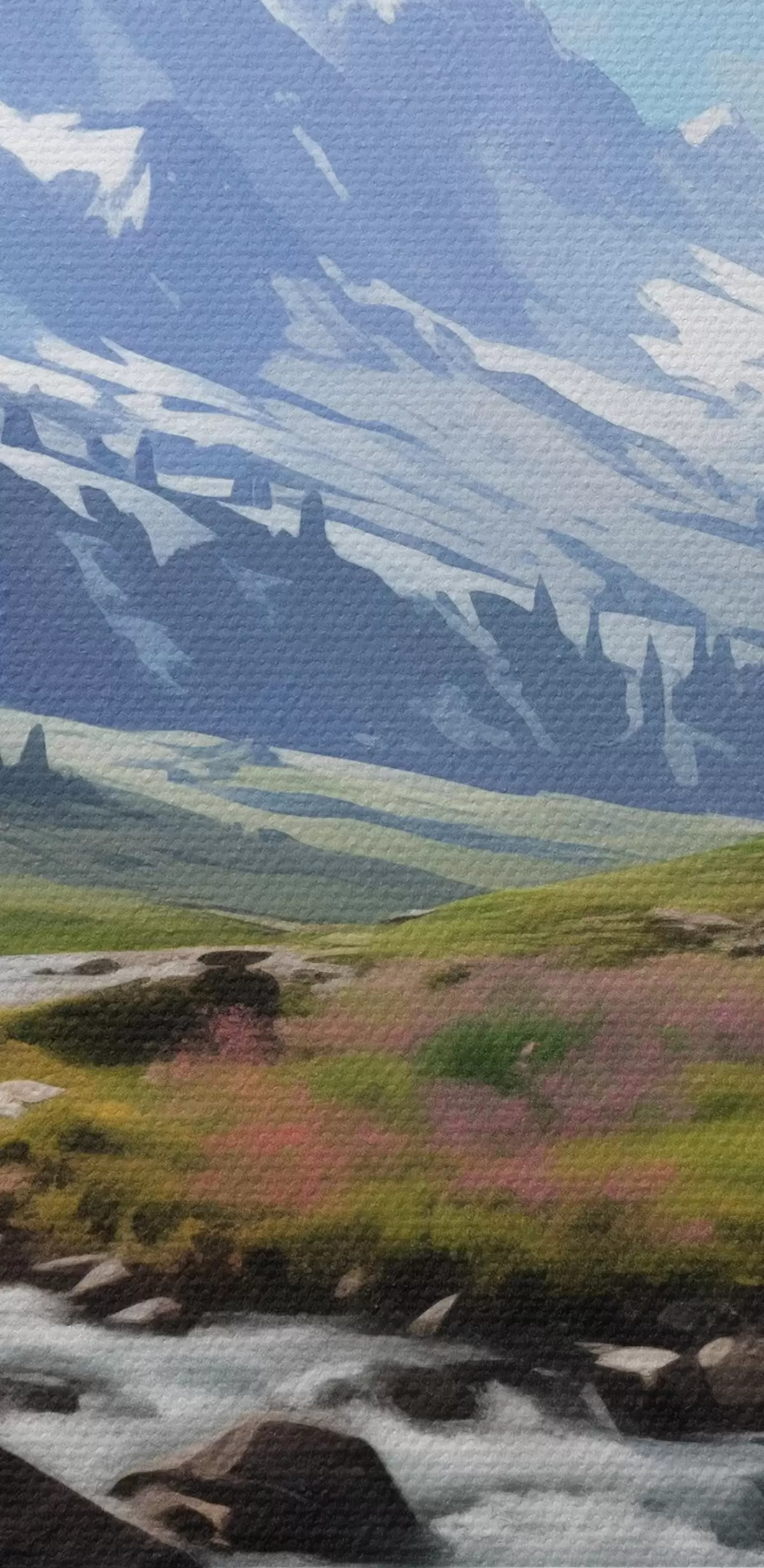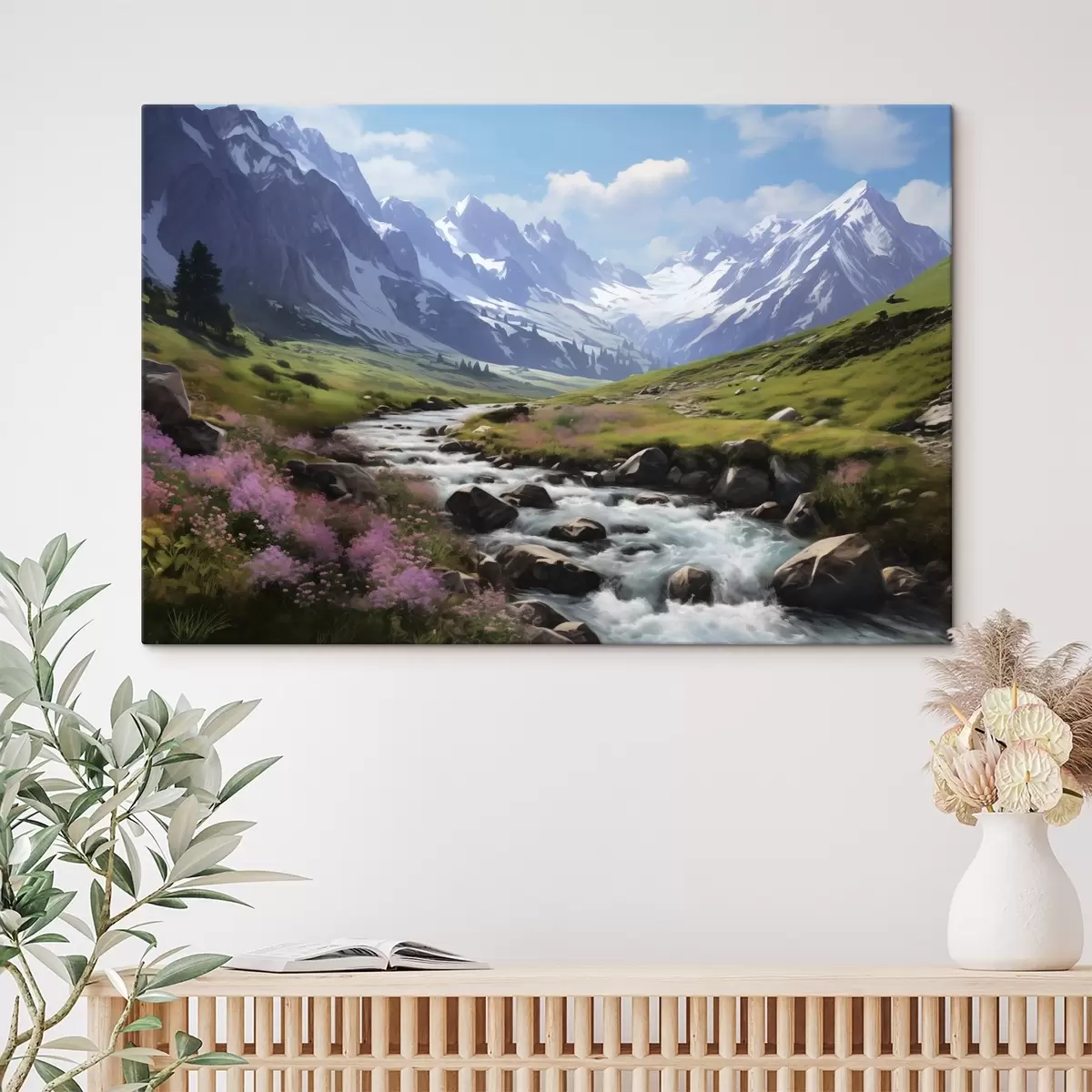 Glezna Kalnu ainava ar strauju straumi, ziedošām pļavām un sniegotām virsotnēm pie apvāršņa zem koši zilām debesīm. Nr s42563