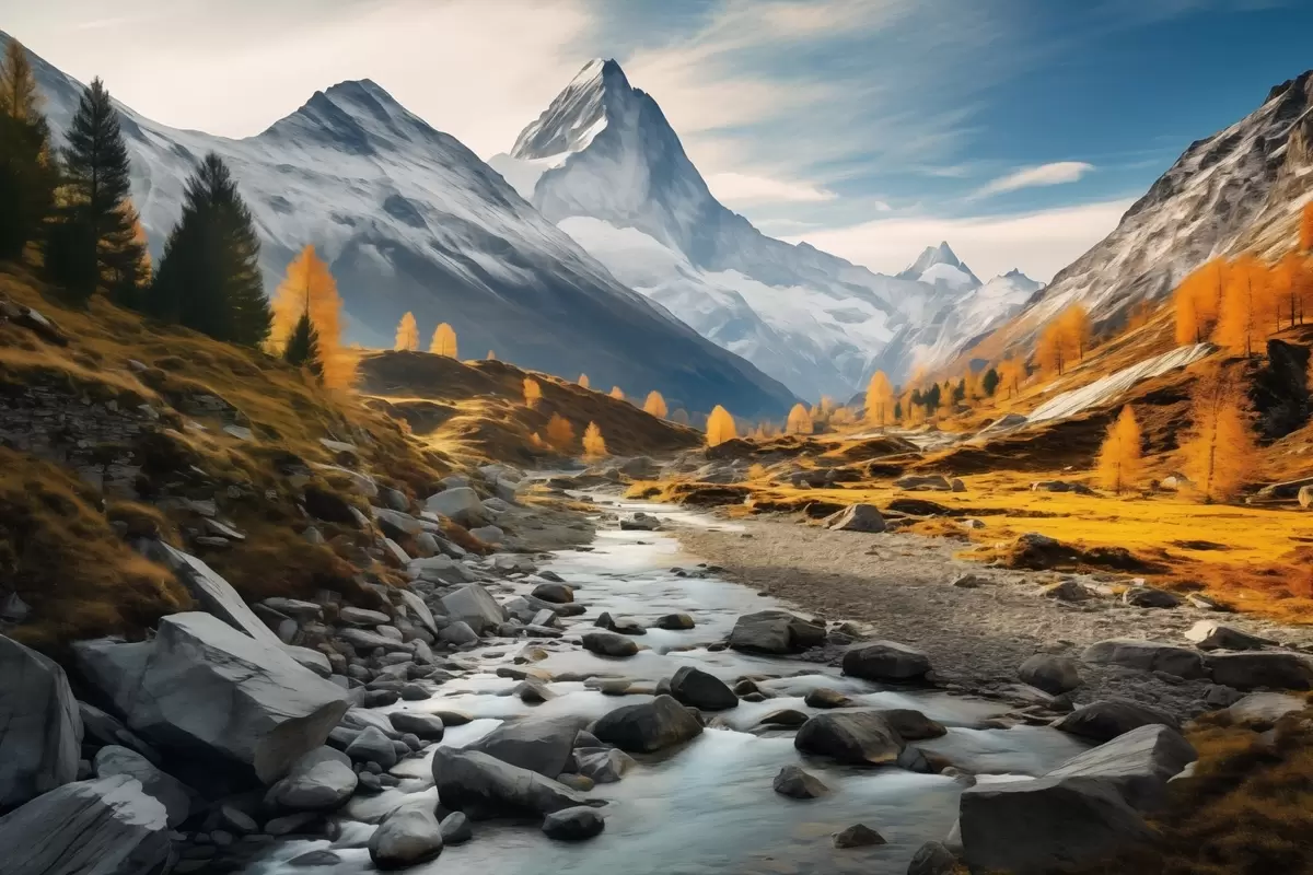 Glezna Rudens kalnu ainava ar straujo upi, kokiem un majestātisko virsotni pret gaišo debesu fonu. s42564