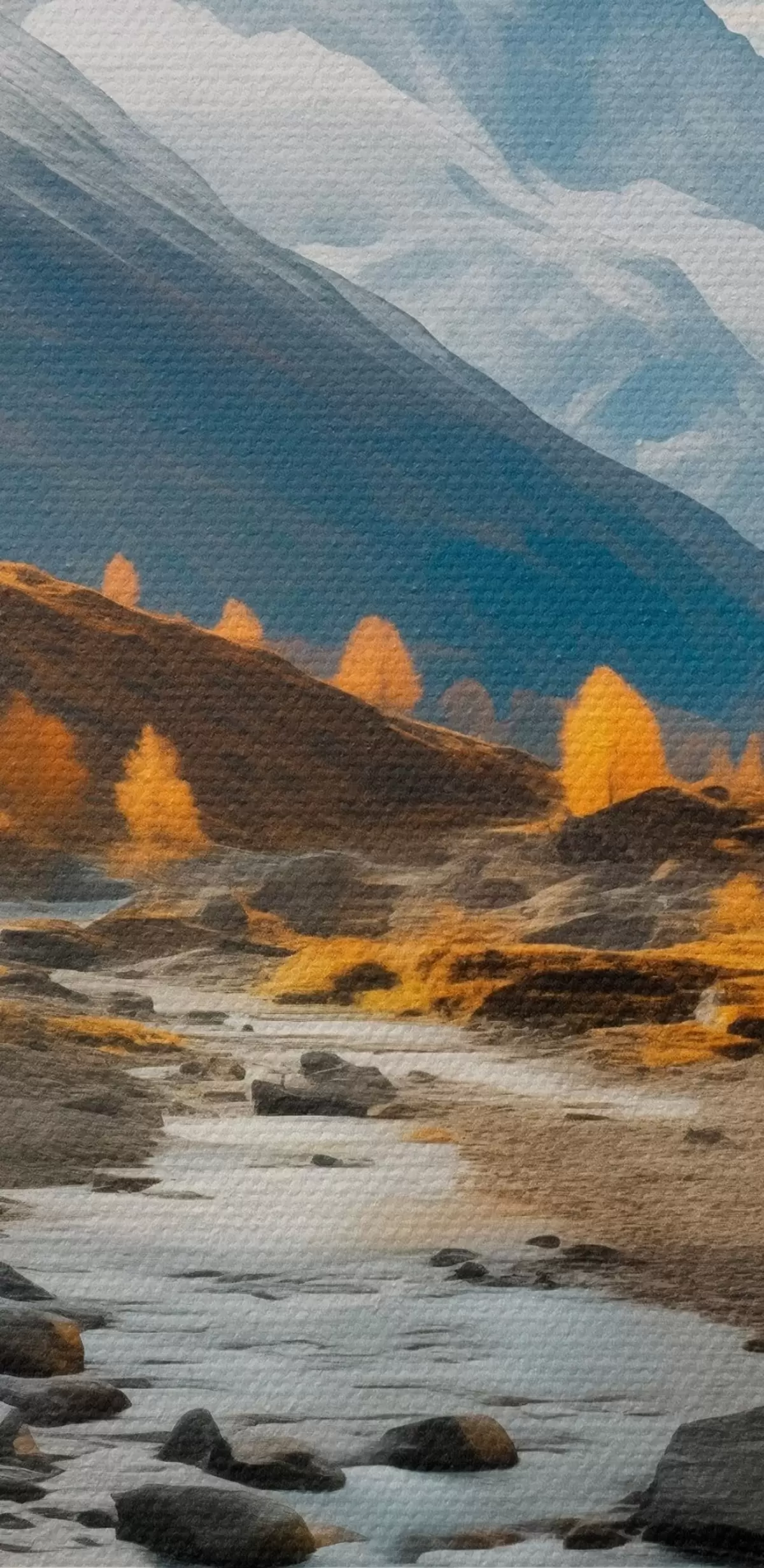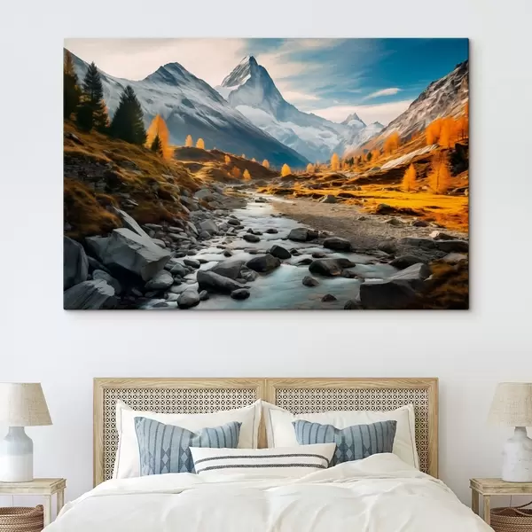 Glezna Rudens kalnu ainava ar straujo upi, kokiem un majestātisko virsotni pret gaišo debesu fonu. Nr s42564