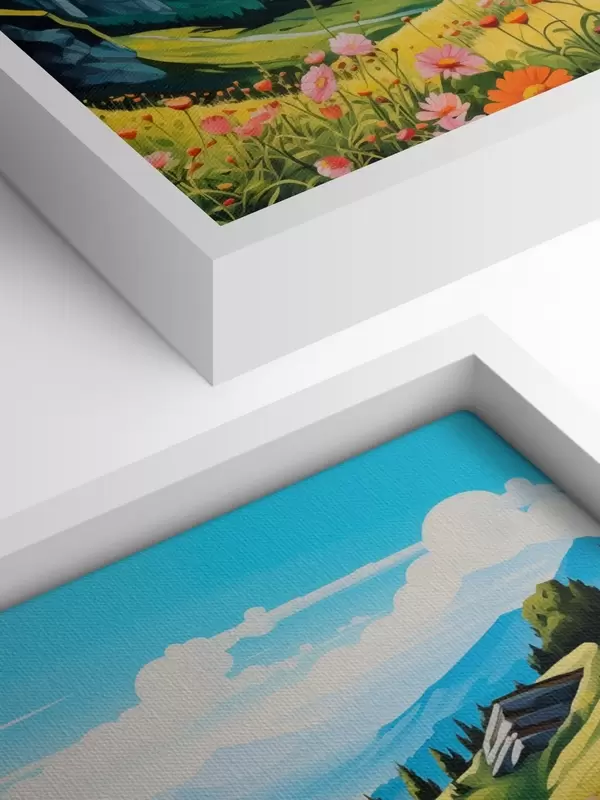 Glezna Spilgta kalnu ainava ar ziedošām pļavām, zaļiem pakalniem un majestātiskām virsotnēm zem skaidrām zilām debesīm. Nr s42565
