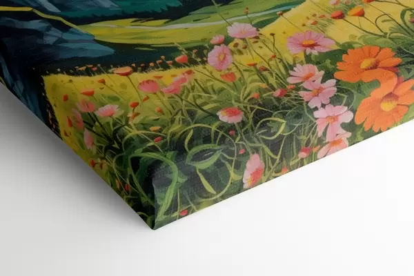 Glezna Spilgta kalnu ainava ar ziedošām pļavām, zaļiem pakalniem un majestātiskām virsotnēm zem skaidrām zilām debesīm. Nr s42565