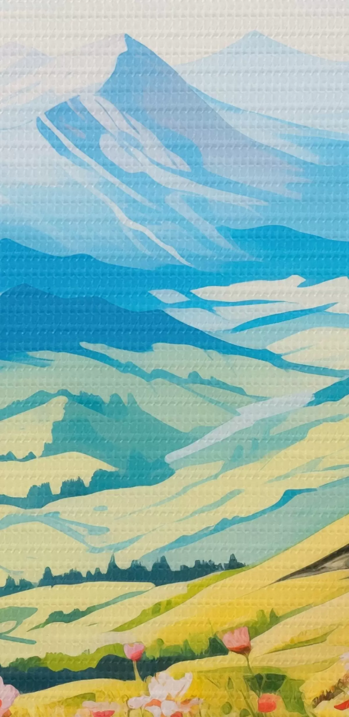 Glezna Spilgta kalnu ainava ar ziedošām pļavām, zaļiem pakalniem un majestātiskām virsotnēm zem skaidrām zilām debesīm. s42565