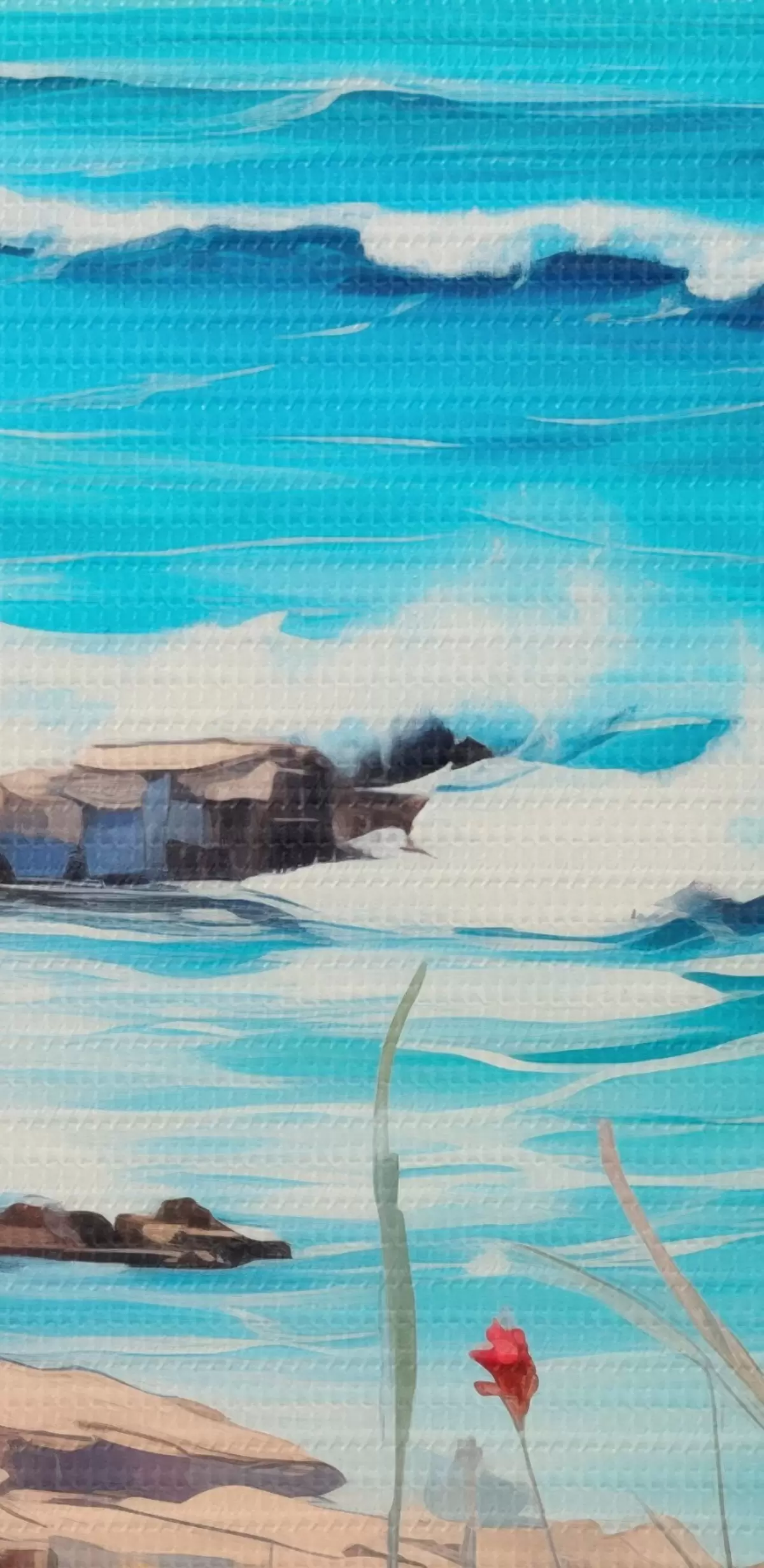 Glezna Jūras ainava ar tirkīza krāsas viļņiem, akmeņainu krastu un košiem ziediem priekšplānā zem skaidrām zilām debesīm. s42568