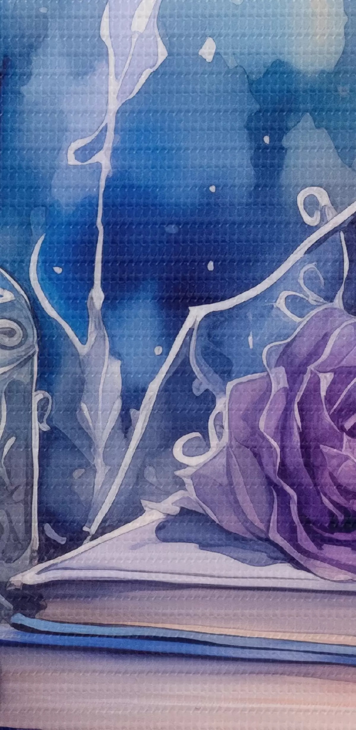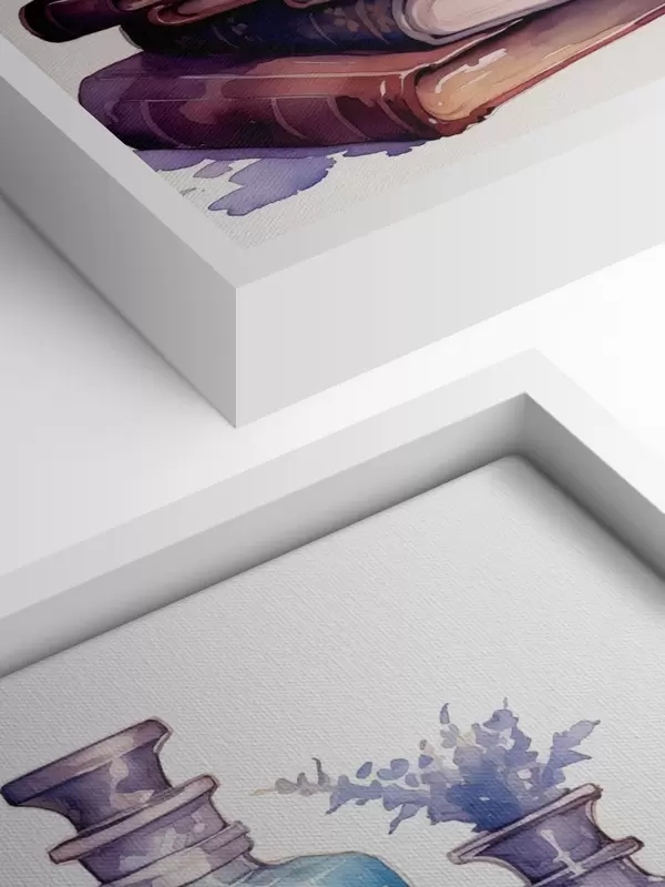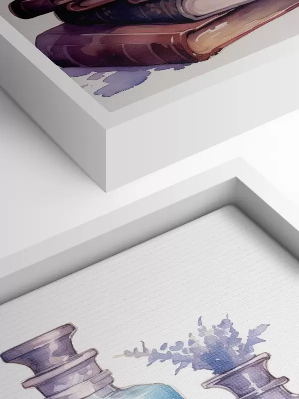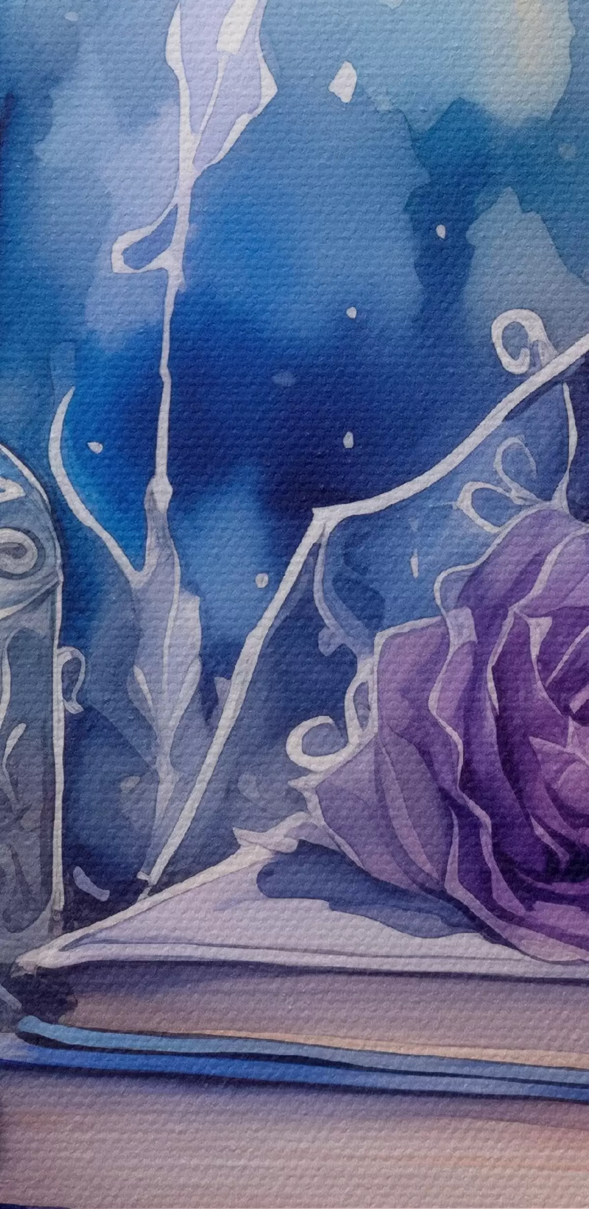 Glezna Klusā daba ar vintage grāmatām, stikla pudelēm zili violetos toņos un dekoratīviem ziediem. s42574