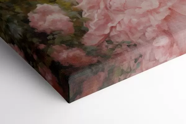 Glezna Divas elegantas sievietes pasteļtoņos sēž dārzā starp rozēm, lasa grāmatu un bauda mierīgu atmosfēru. s42582