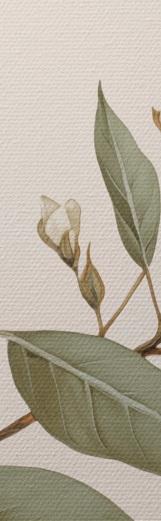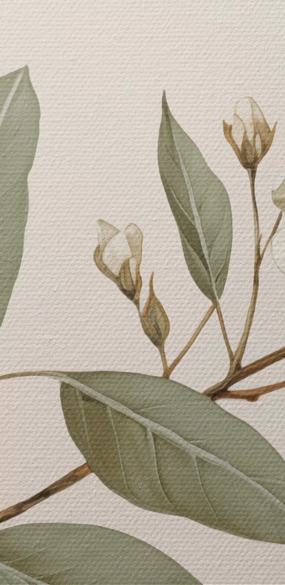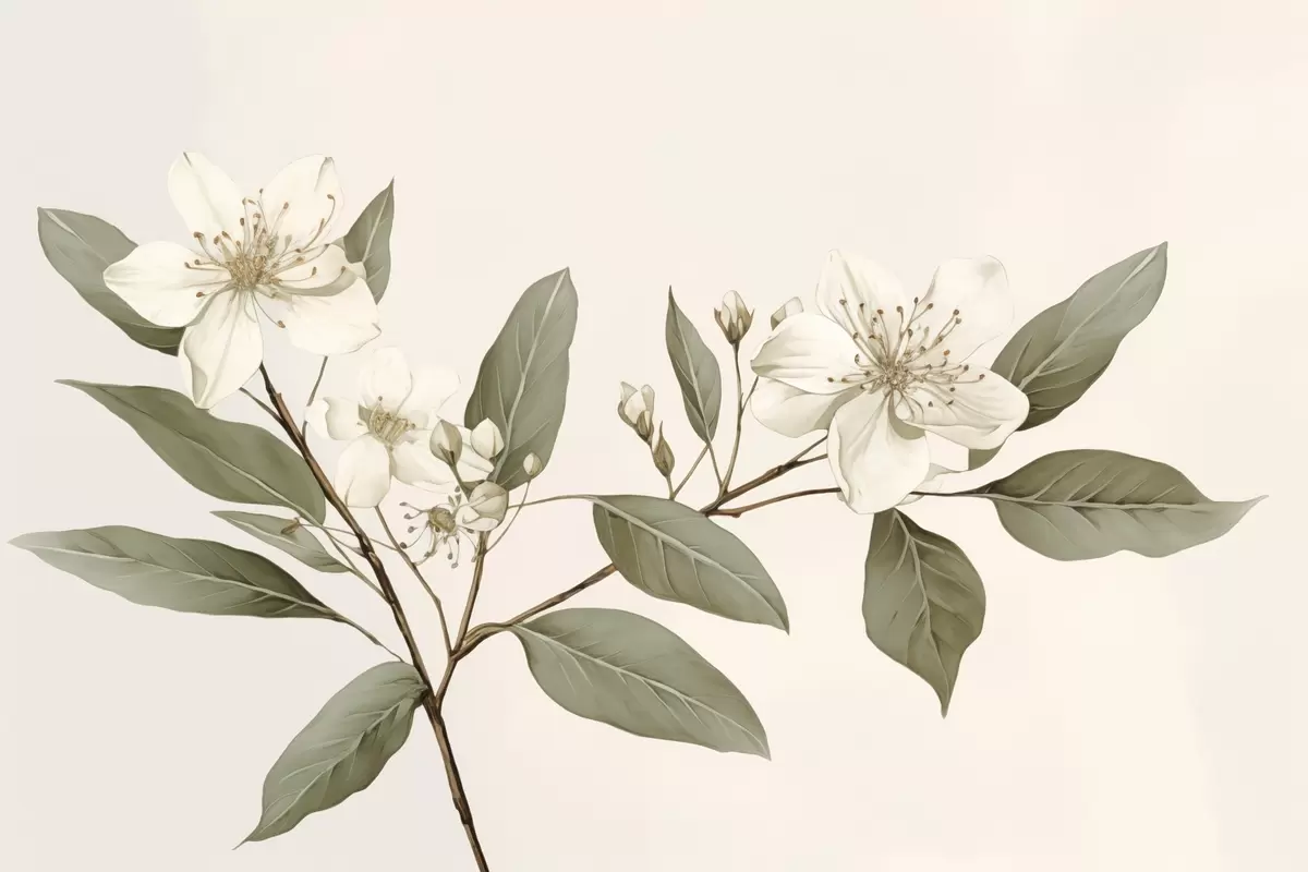 Glezna Smalks zars ar baltiem ziediem un zaļām lapām uz gaiša fona, ar maigām detaļām un elegantu stilu. s42583