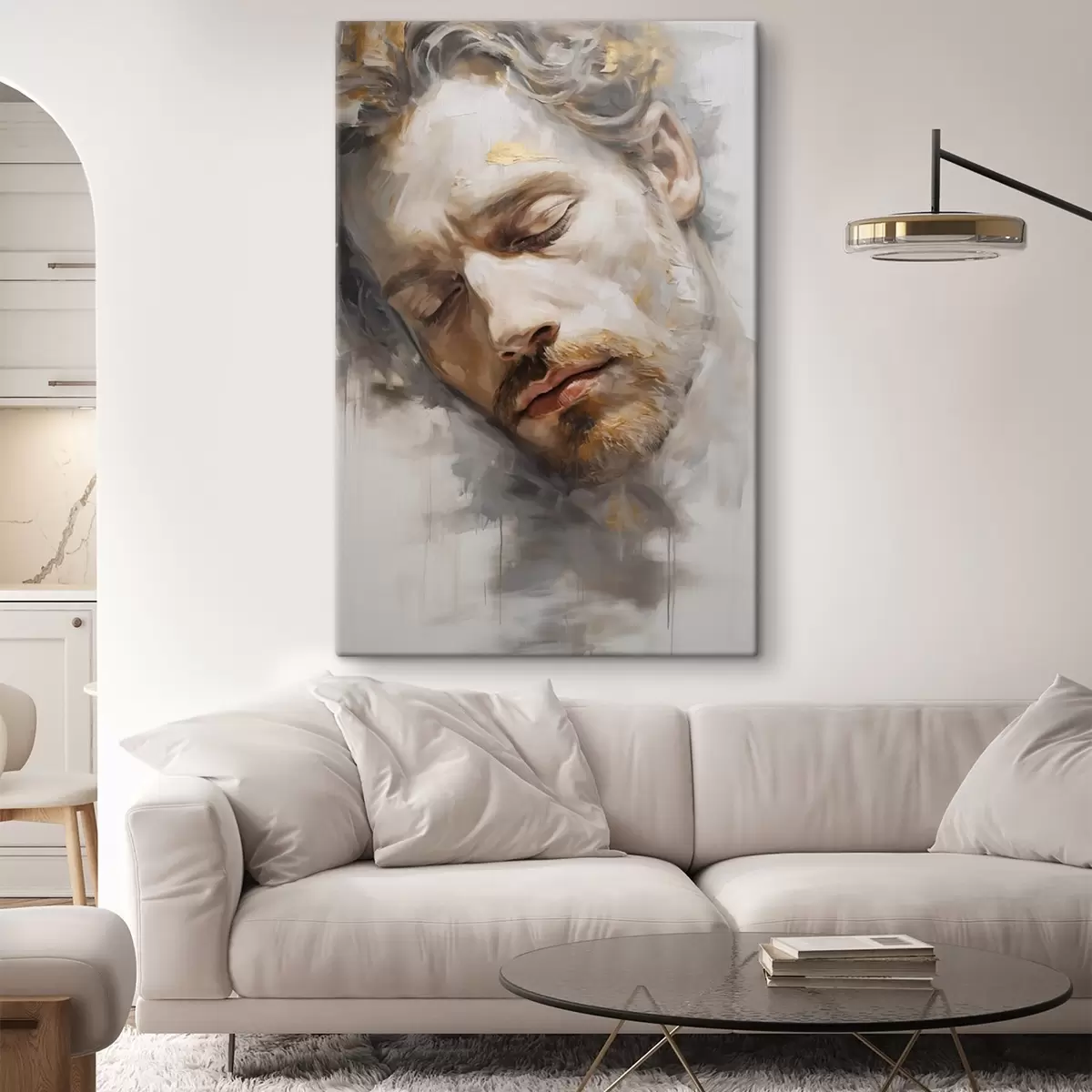Glezna Abstrakts vīrieša portrets ar aizvērtām acīm, kas veidots maigos, siltos toņos ar gludiem otas triepieniem, kuri rada miera sajūtu. Nr s42621
