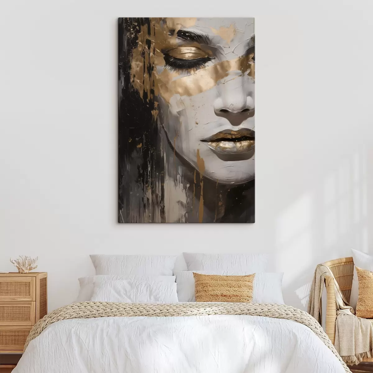 Glezna Sievietes abstrakts portrets, kurā uzsvērtas aizvērtās acis un lūpas, veidots melnbaltos toņos ar dinamiskiem, siltas krāsas otas triepieniem. Nr s42626