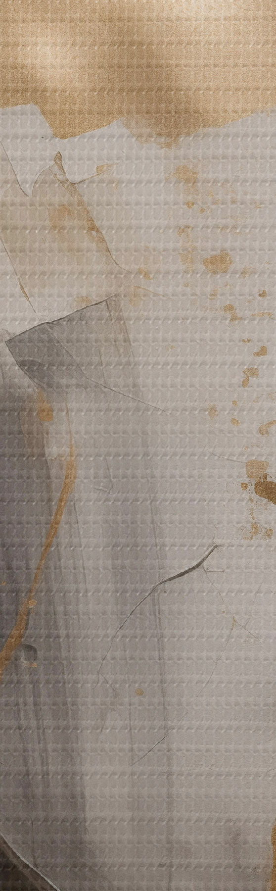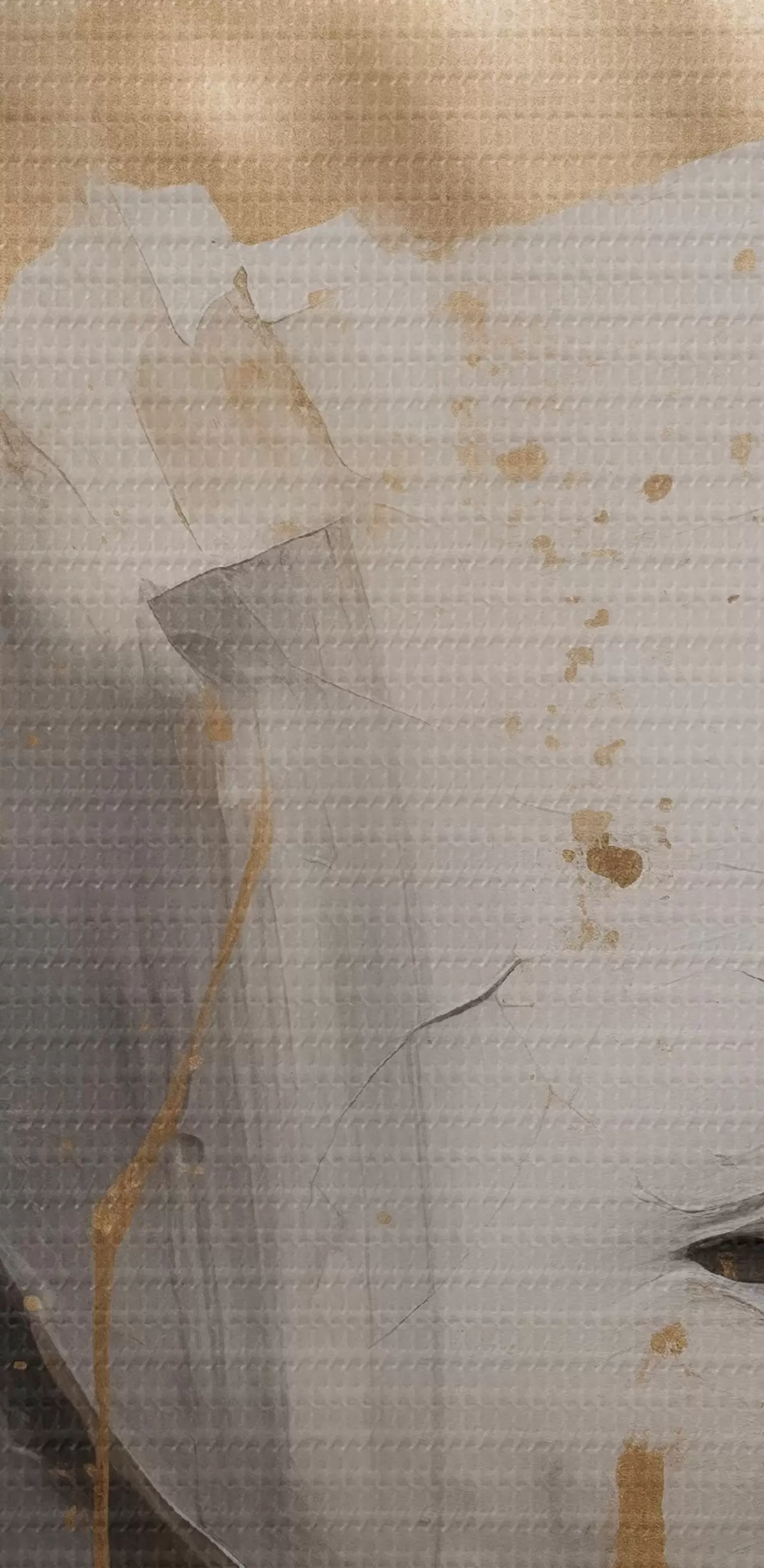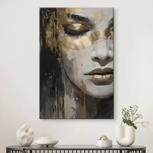 Glezna Sievietes abstrakts portrets, kurā uzsvērtas aizvērtās acis un lūpas, veidots melnbaltos toņos ar dinamiskiem, siltas krāsas otas triepieniem. s42626