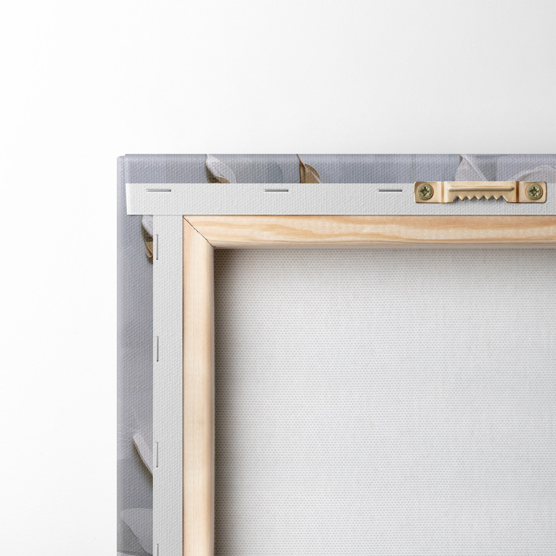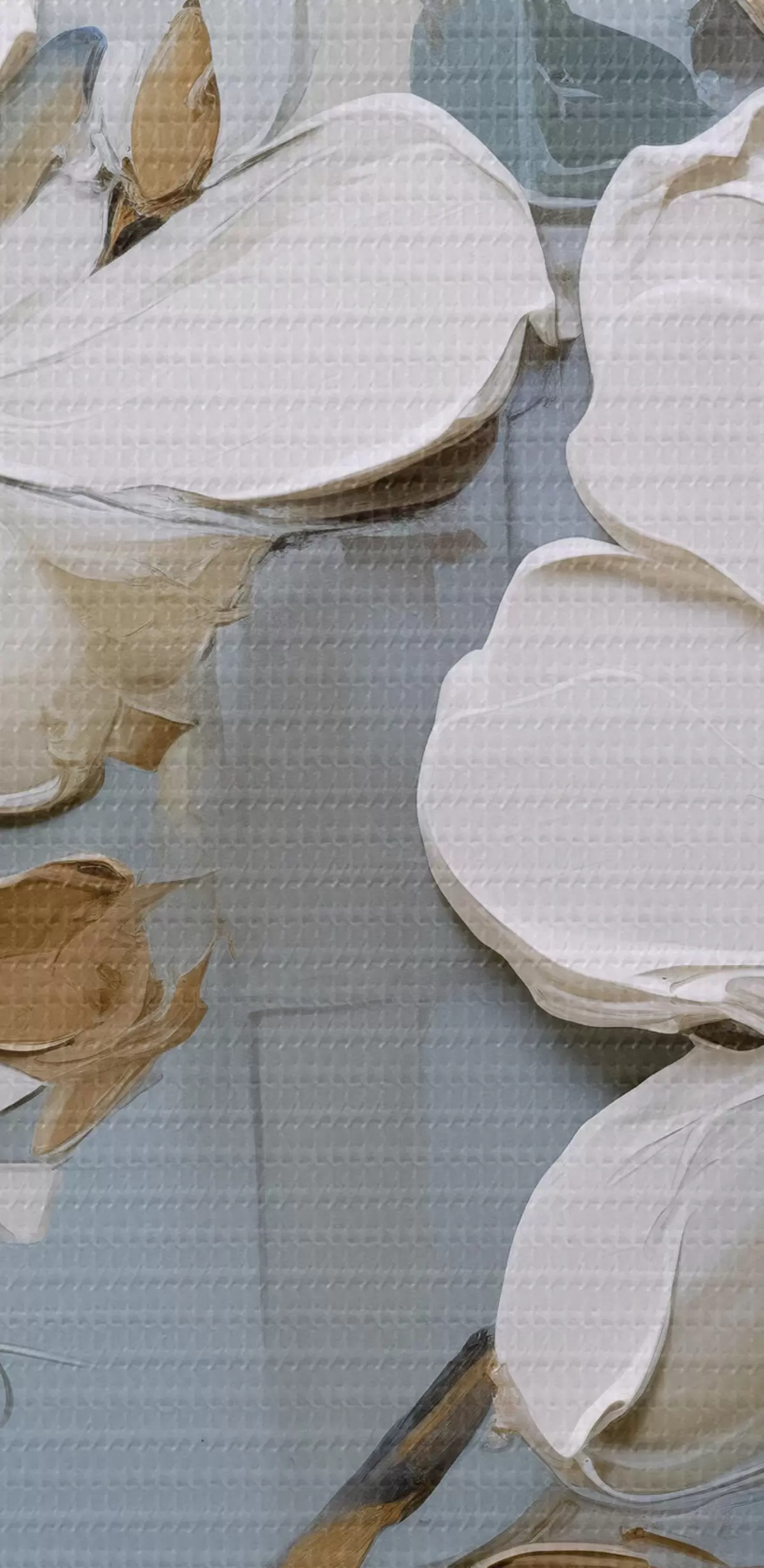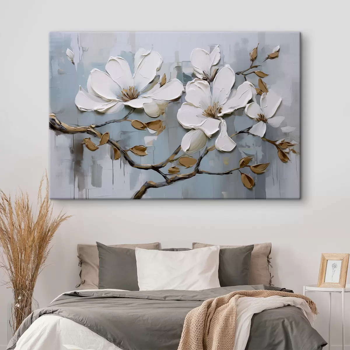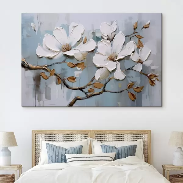 Glezna Balti magnolijas ziedi ar teksturētām ziedlapiņām un brūnām lapām uz maigi zila fona eļļas glezna imitācija Nr s42711