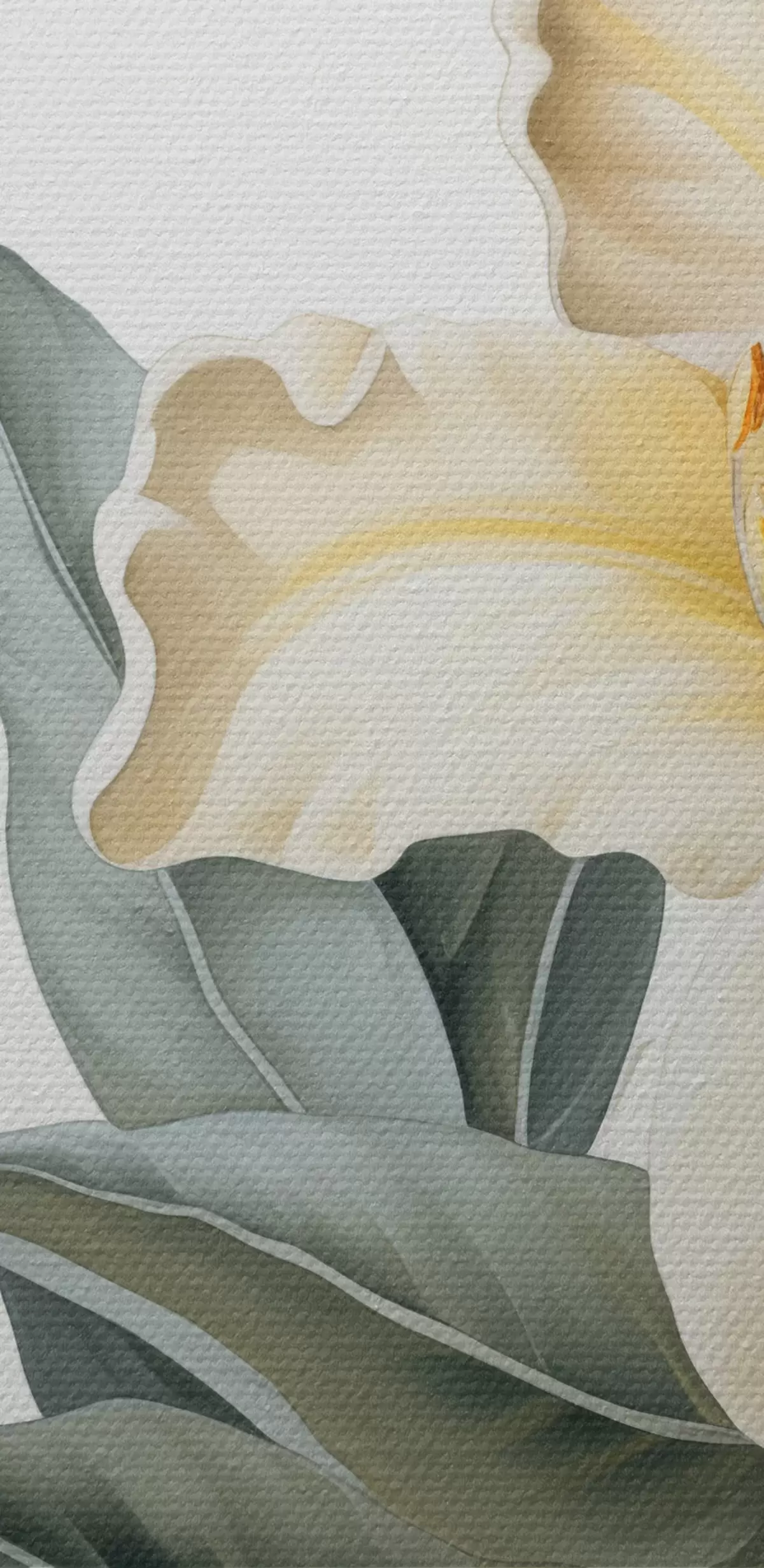 Glezna Botāniska ilustrācija ar baltiem un gaiši dzelteniem ziediem ar sarežģītiem ziedlapiņām, ko ieskauj zaļas lapas s42712