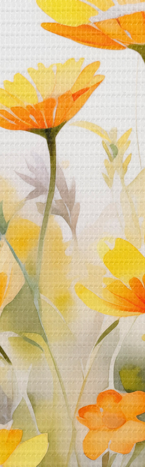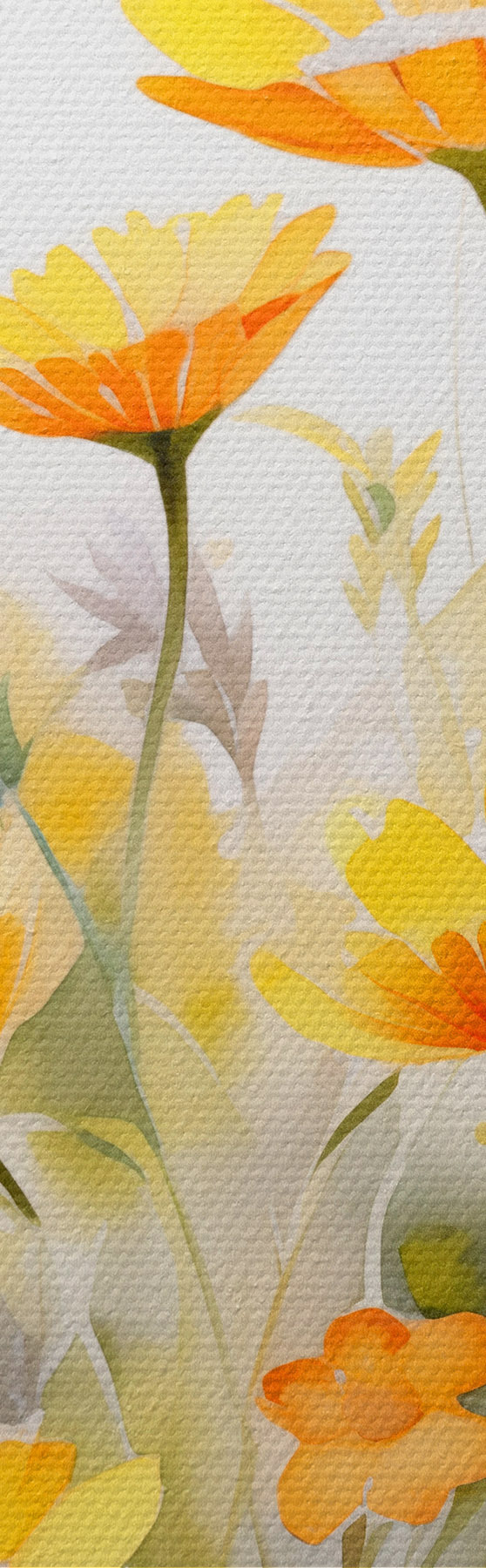 Glezna Spilgts, akvarelim līdzīgs ziedu lauks ar oranžām un baltām margrietiņām un netālu lidojošu tauriņu Nr s42714
