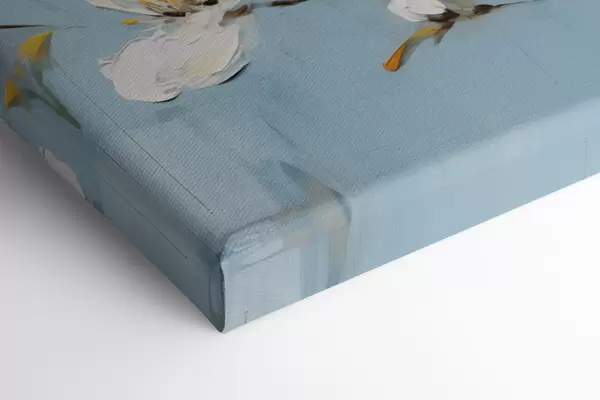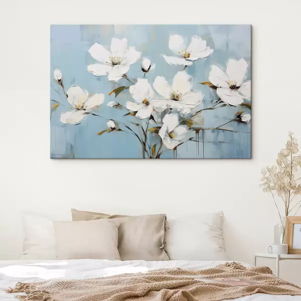 Glezna Balti ziedi ar maigām ziedlapiņām un zaļām lapām uz gaiši zila fona eļļas glezna imitācija Nr s42719
