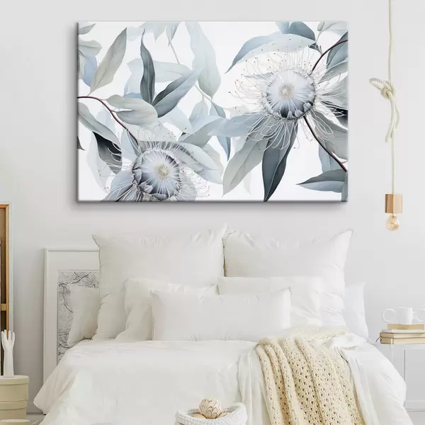 Glezna Detalizēta botāniska ilustrācija ar eikalipta ziediem ar baltiem pavedieniem, ko ieskauj maigas, gaiši zaļas lapas Nr s42725