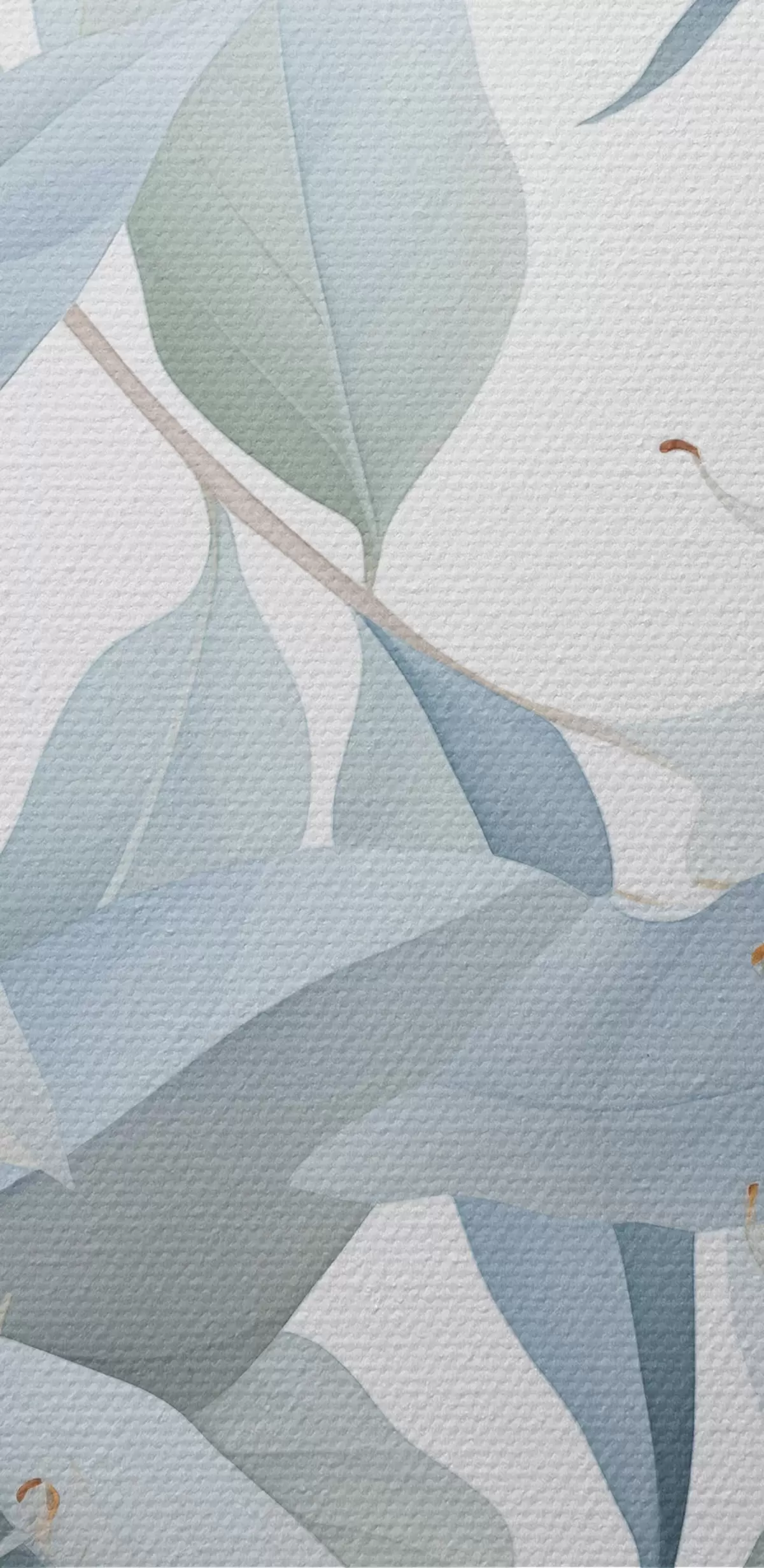 Glezna Detalizēta botāniska ilustrācija ar eikalipta ziediem ar baltiem pavedieniem, ko ieskauj maigas, gaiši zaļas lapas s42725