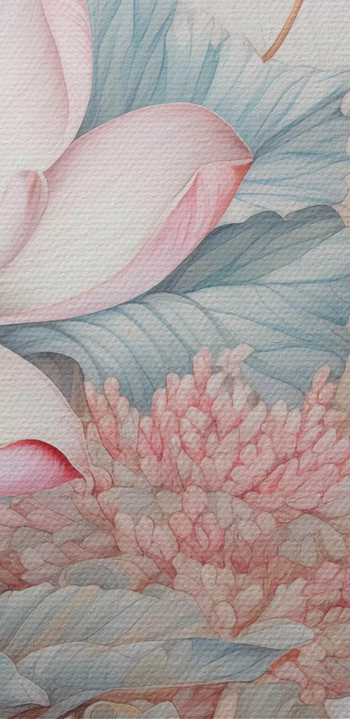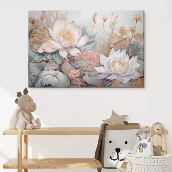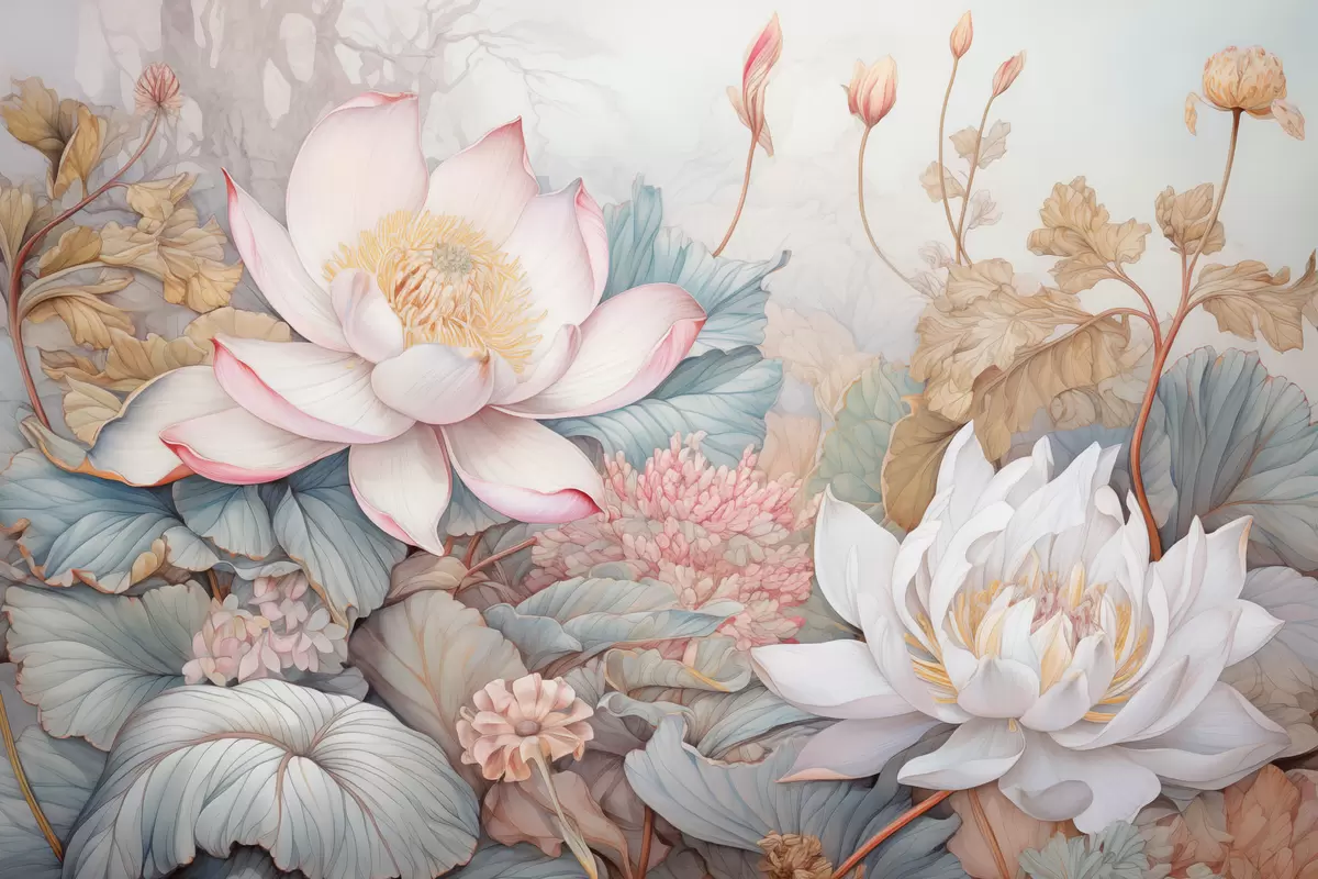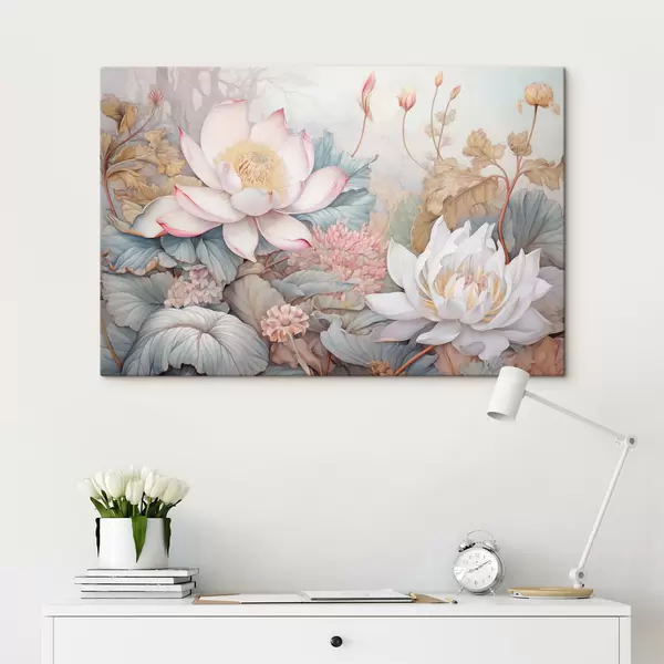 Glezna Lieli, ziedoši lotosa ziedi maigi rozā un baltā krāsā, ko ieskauj zaļas lapas un maigi rozā zaļgani zaļumi Nr s42729