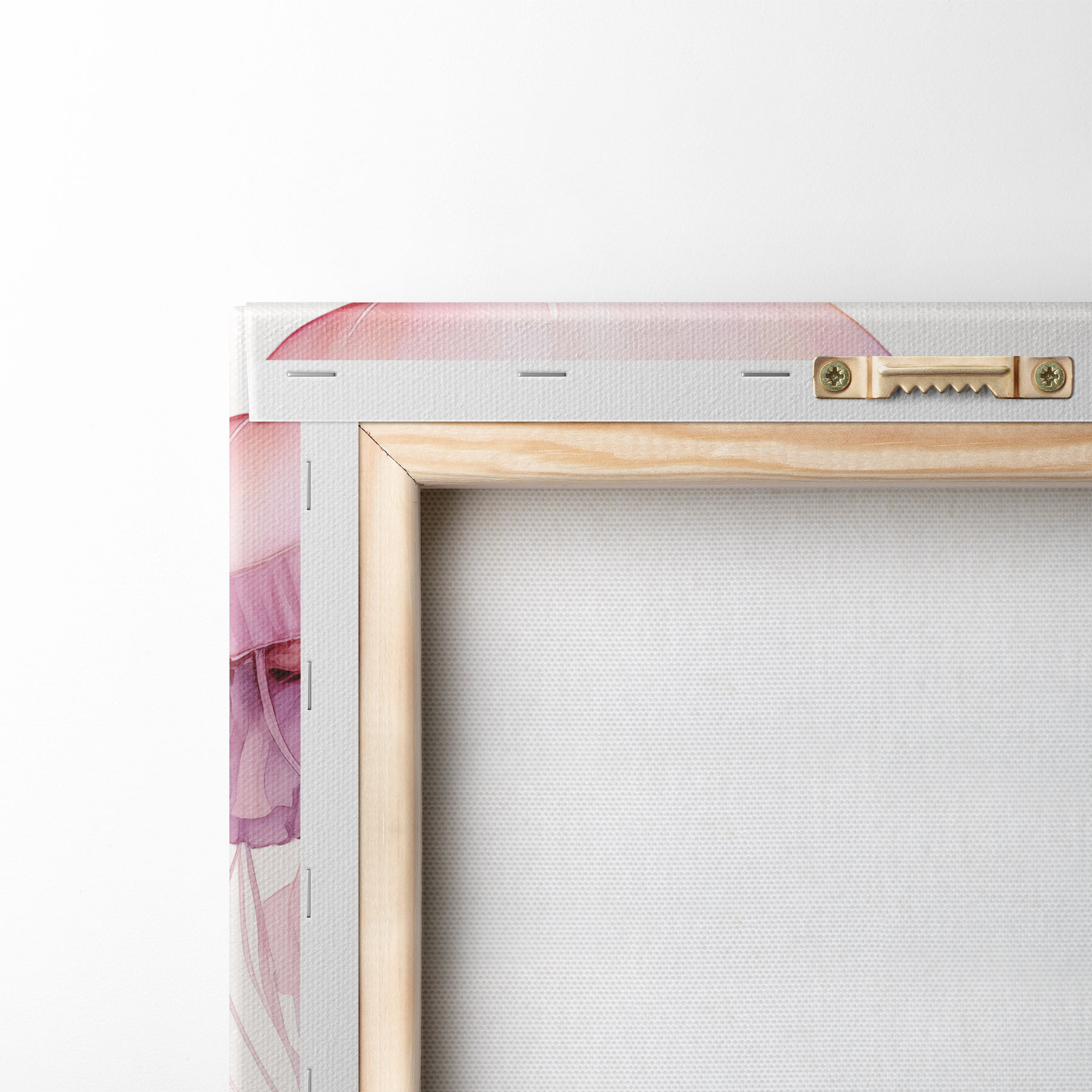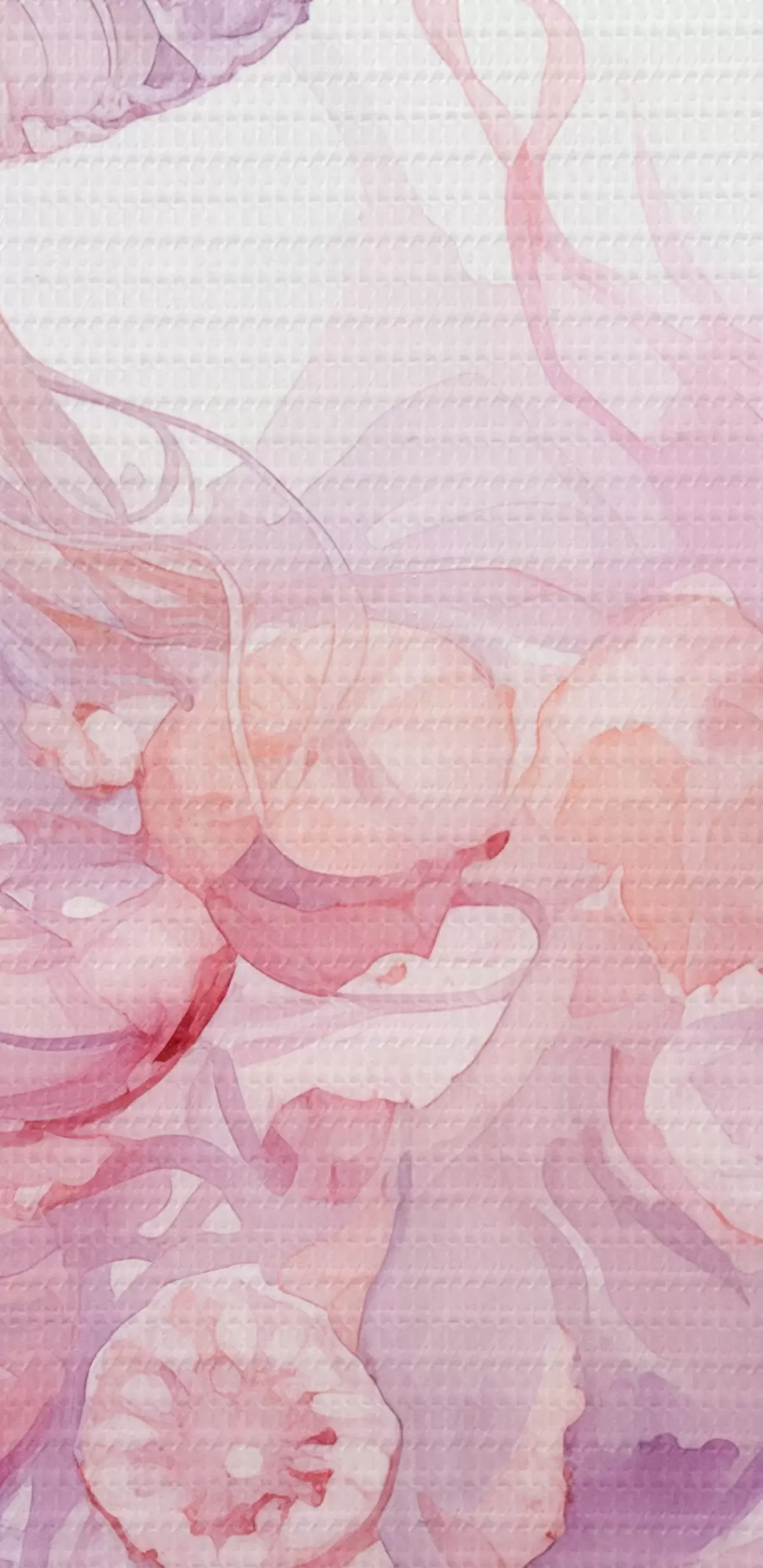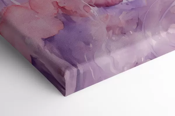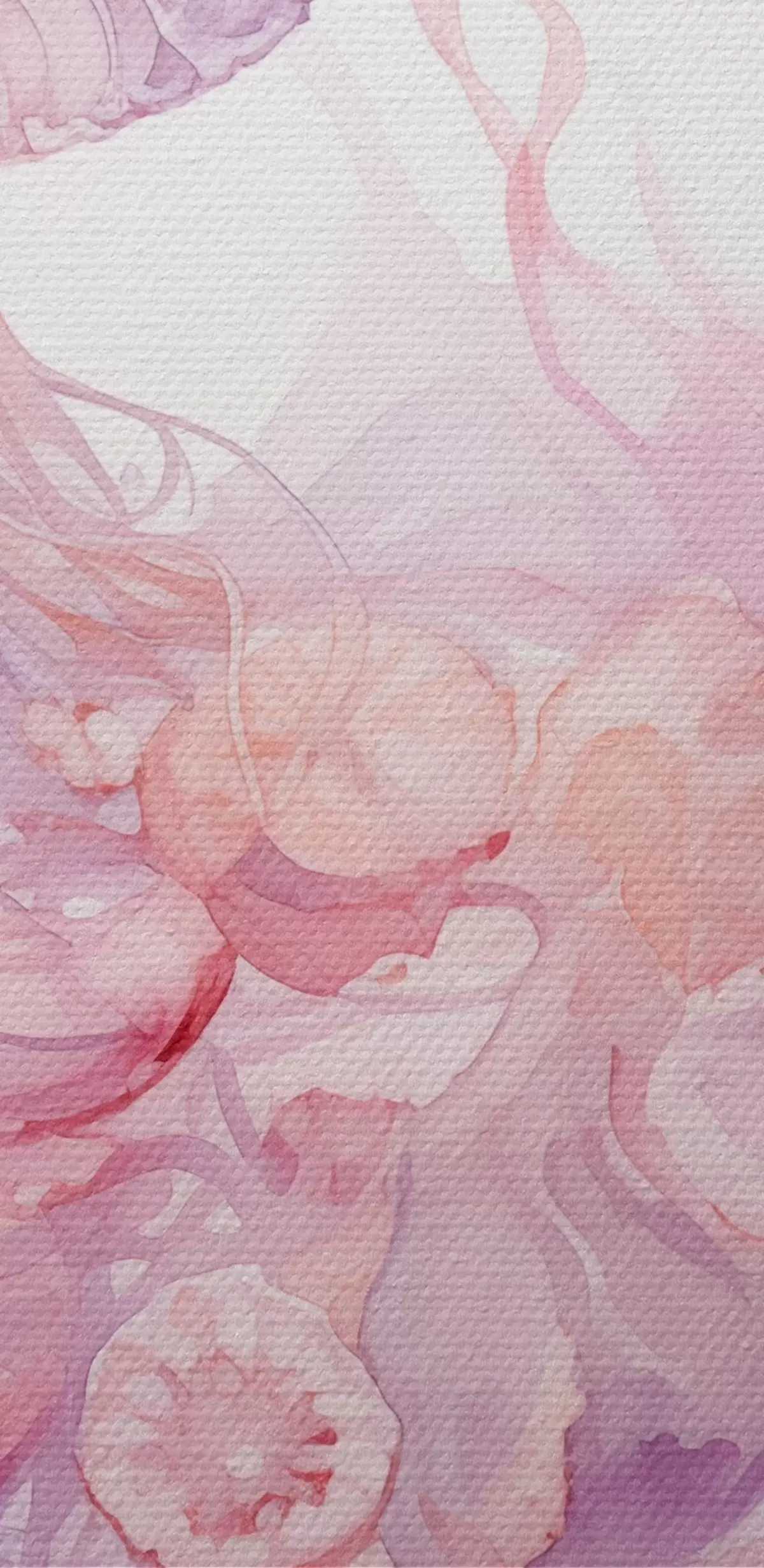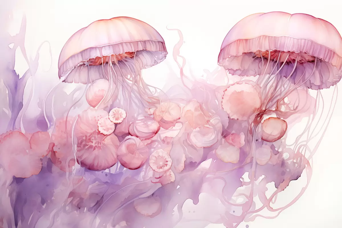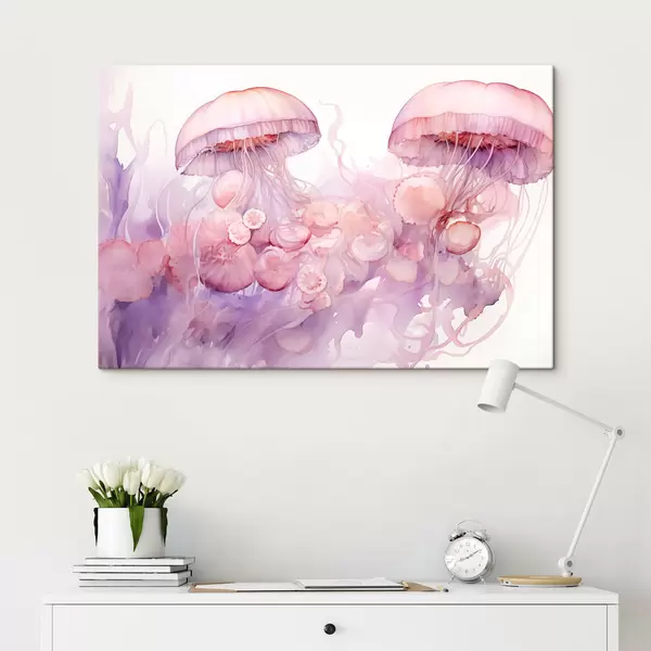 Glezna Rozā medūzas, kas peld maigu rozā un violetu nokrāsu virpulī, ieskauj abstraktas figūras  s42730