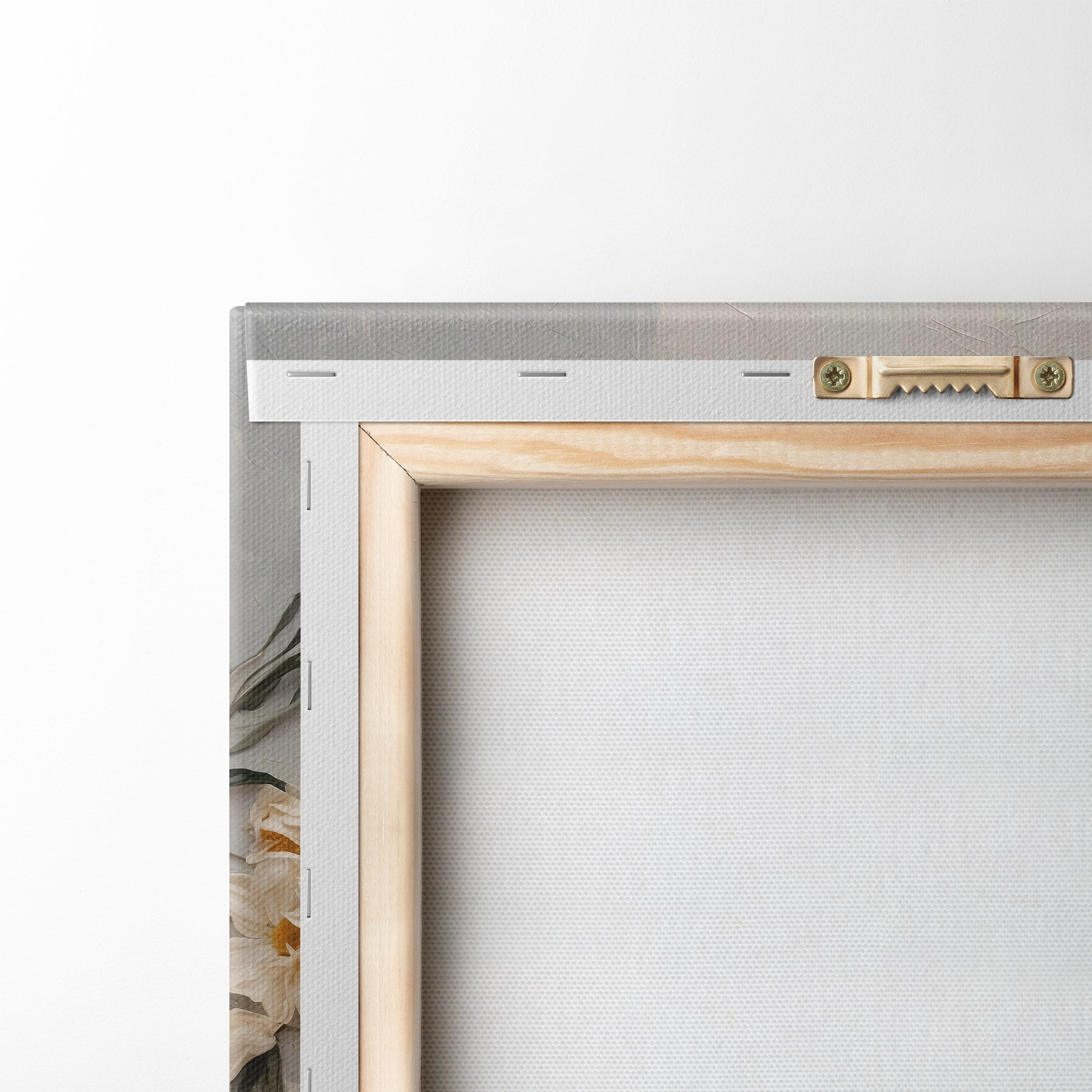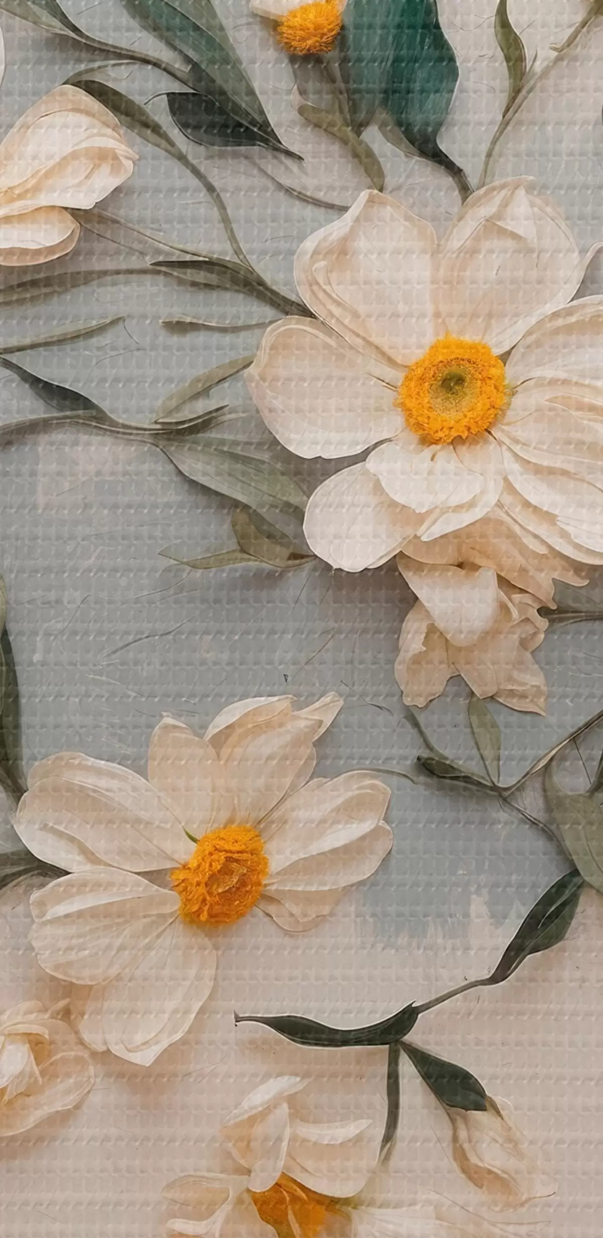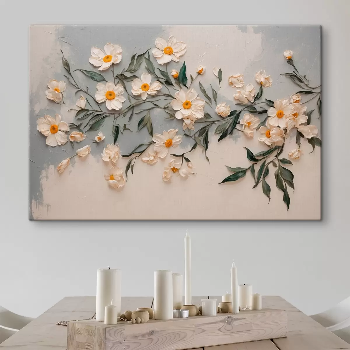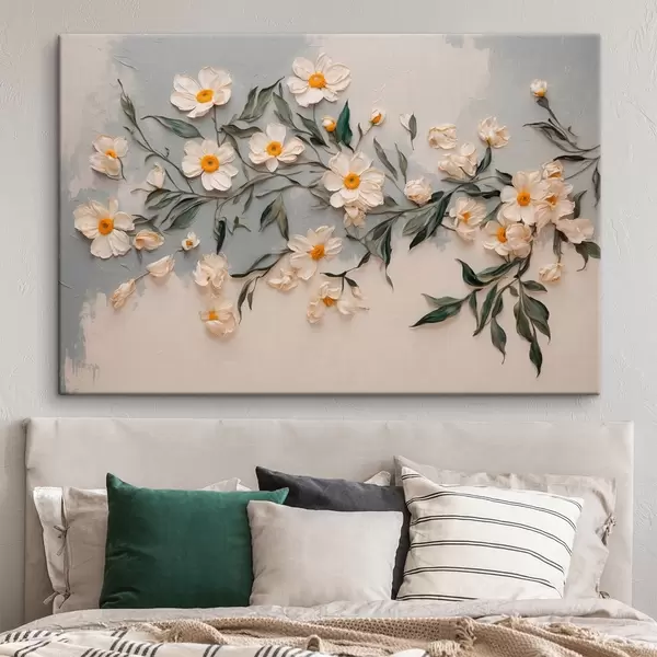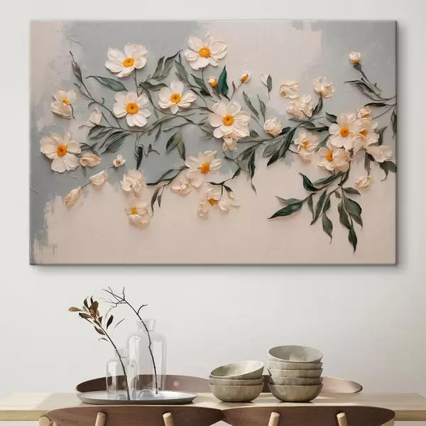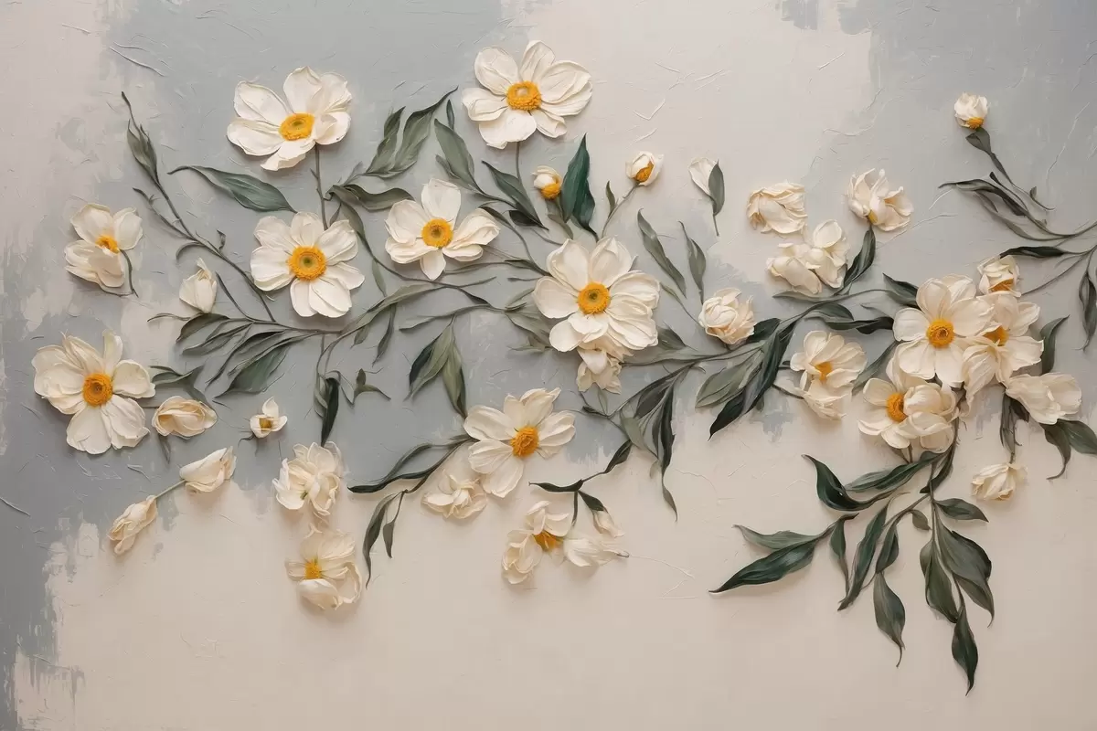 Glezna Balti ziedi un lapas uz balta un pelēka fona Nr s42764