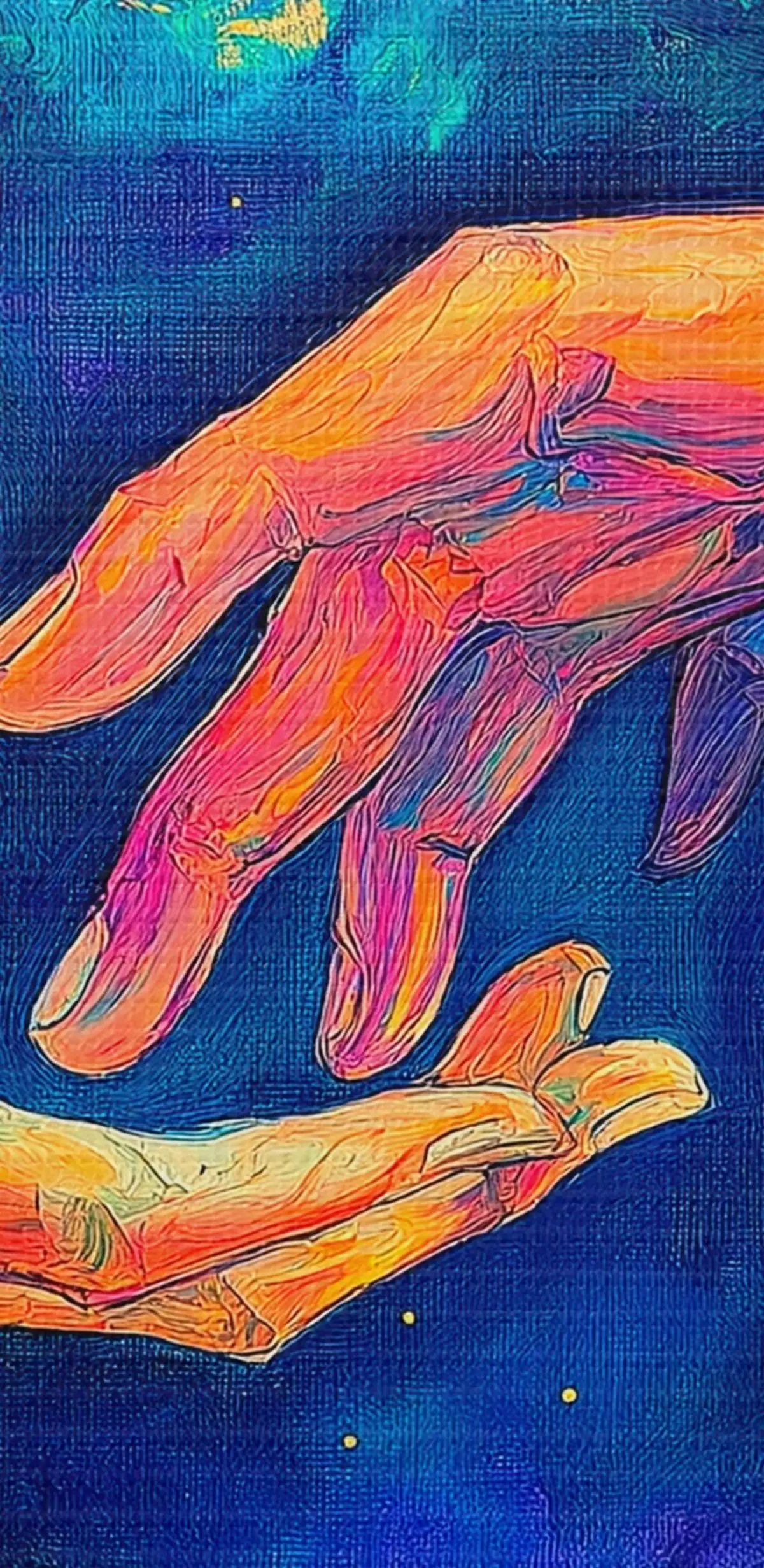 Glezna Abstrakta kompozīcija ar divām rokām, kas sniedzas viena otrai, košā krāsu paletē uz kosmiska fona s42937