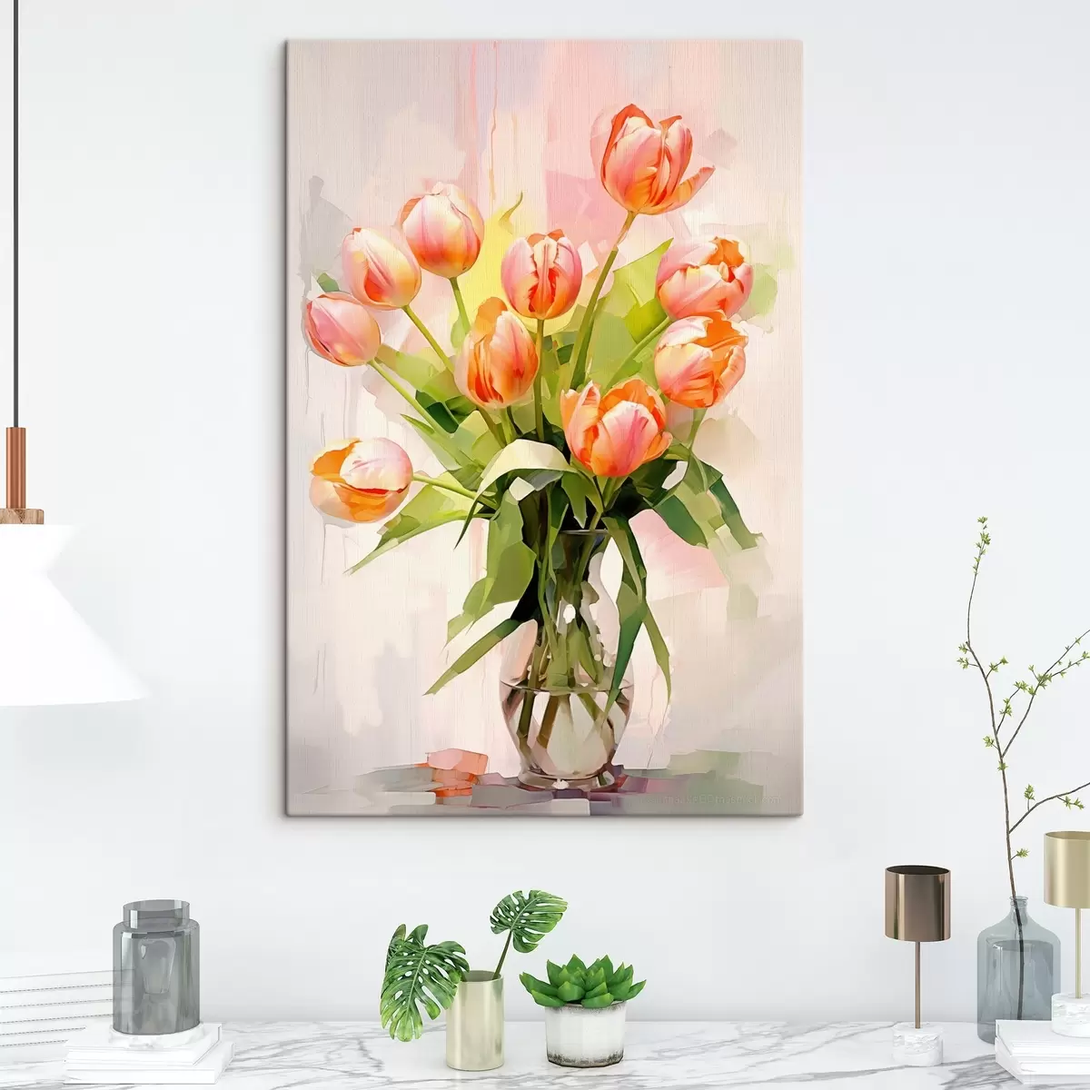 Glezna Gleznieciska klusā daba ar tulpēm stikla vāzē uz gaiša fona Nr s42940