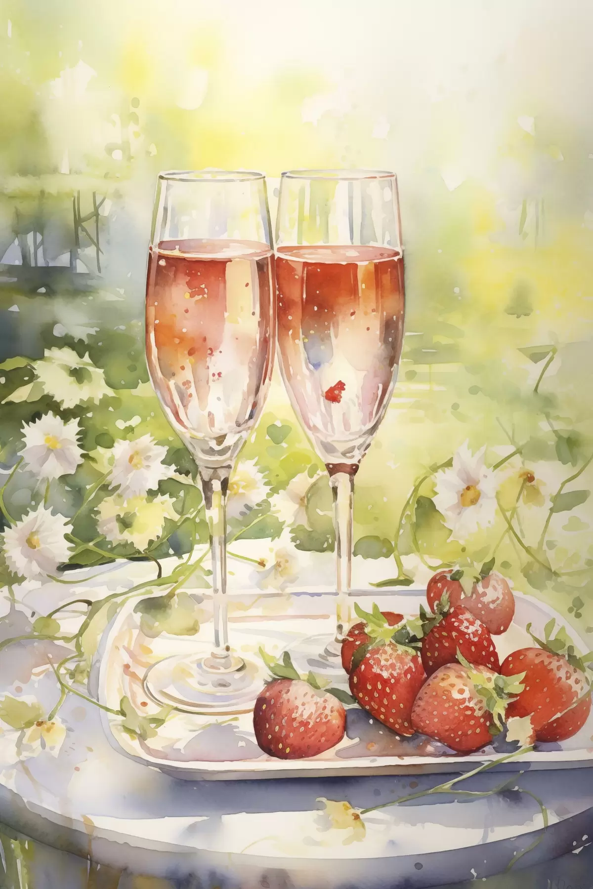 Glezna Akvareļa stila zīmējums ar šampanieša glāzēm, ziediem un zemenēm Nr s43056