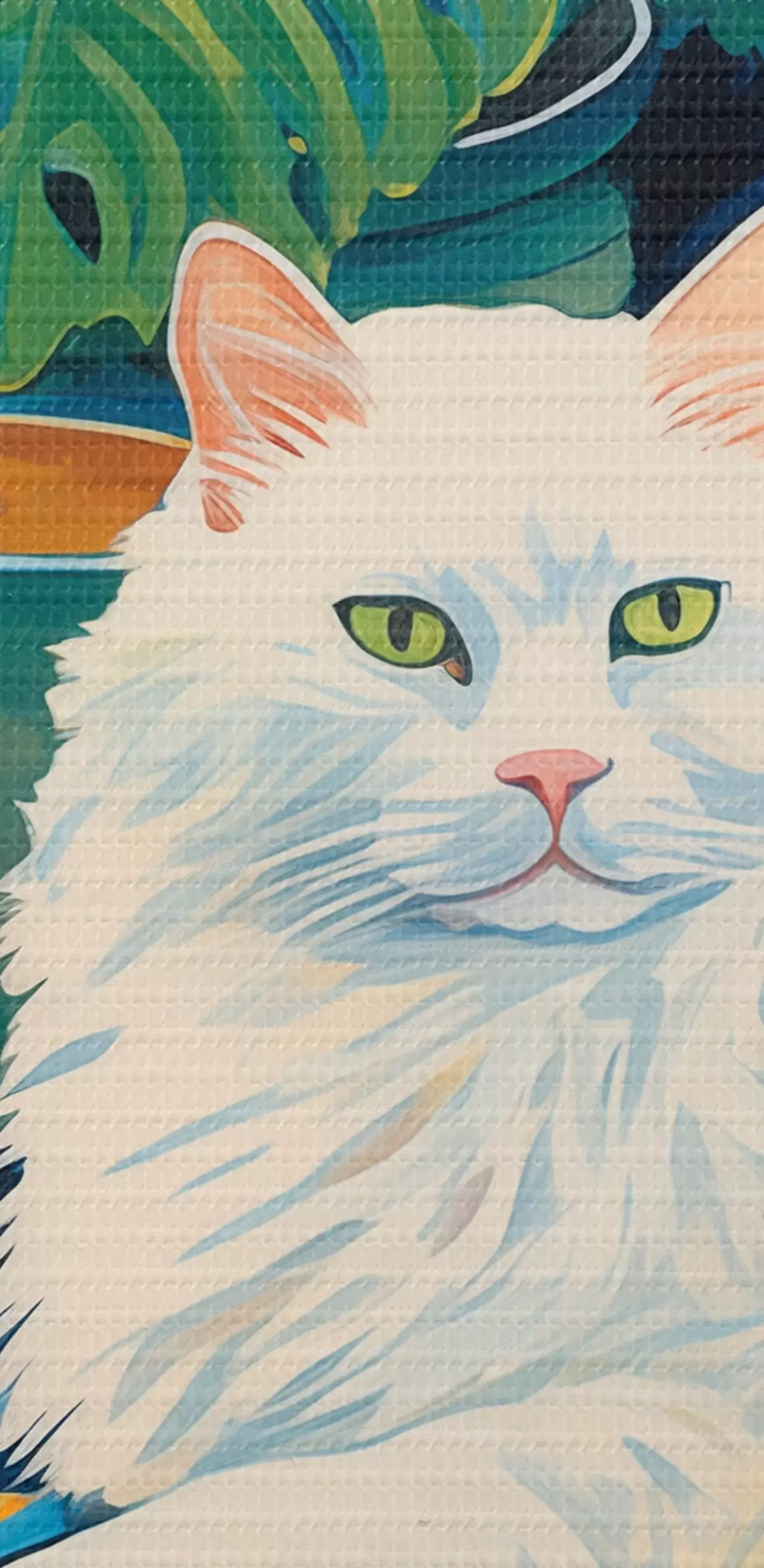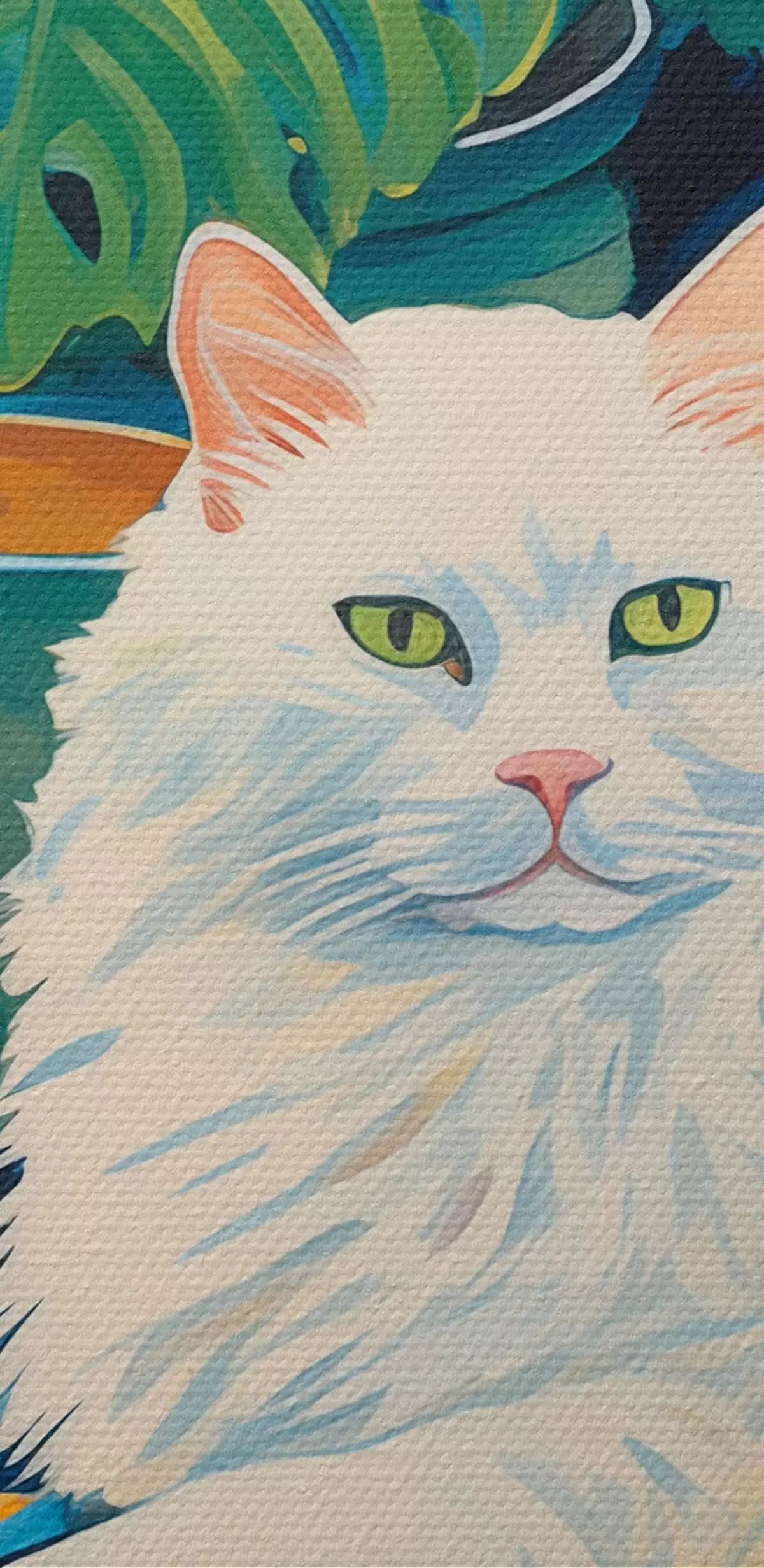 Glezna Balts kaķis sulīgu apstādījumu un keramikas podiņu vidū Nr s43131