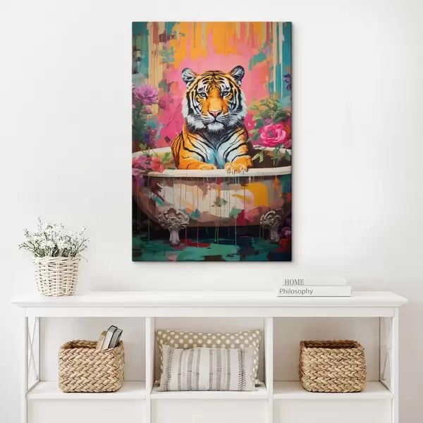 Glezna Abstrakts tīģeris vannā, ko ieskauj koši ziedi s43134