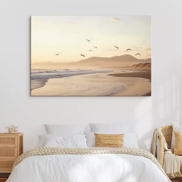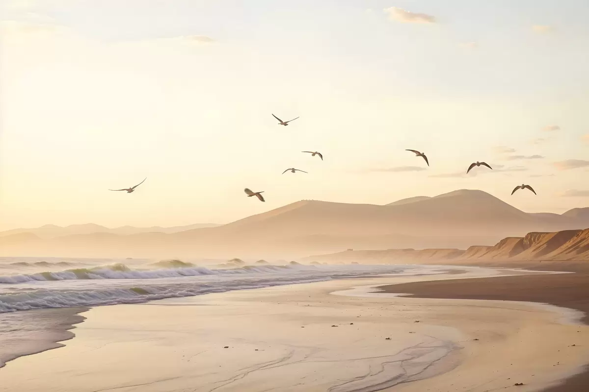 Glezna Putni lido pāri pludmalei ar okeānu, kalni fonā, siltas krāsas, mīksta pasteļkrāsu palete Nr s43162