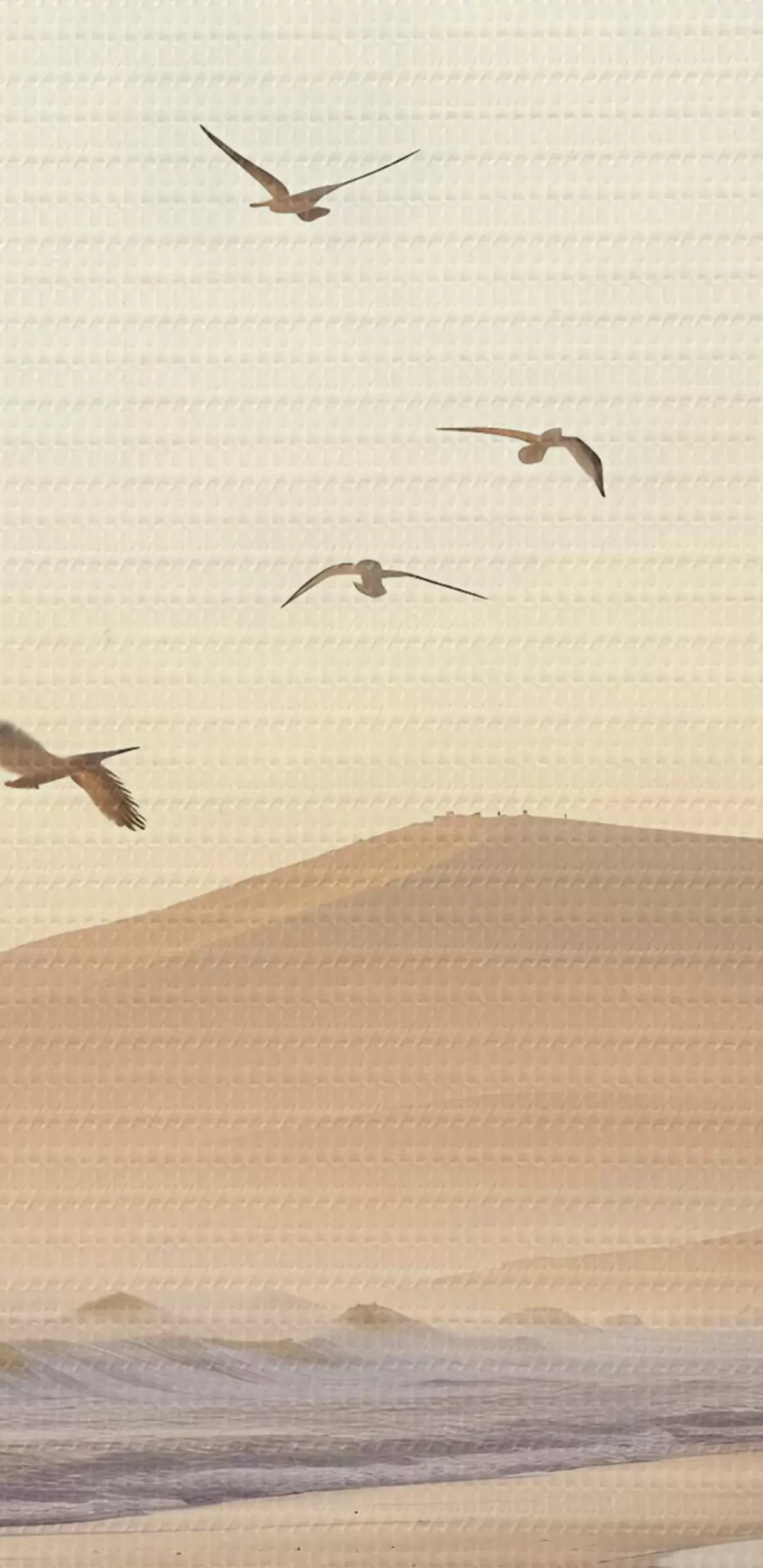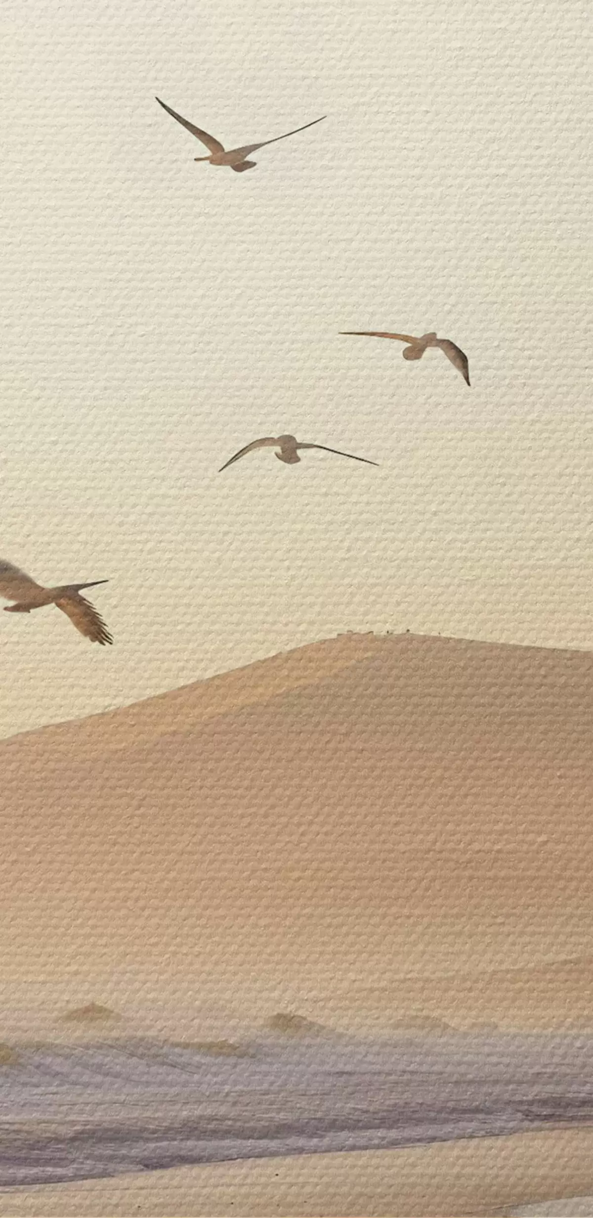 Glezna Putni lido pāri pludmalei ar okeānu, kalni fonā, siltas krāsas, mīksta pasteļkrāsu palete  s43162