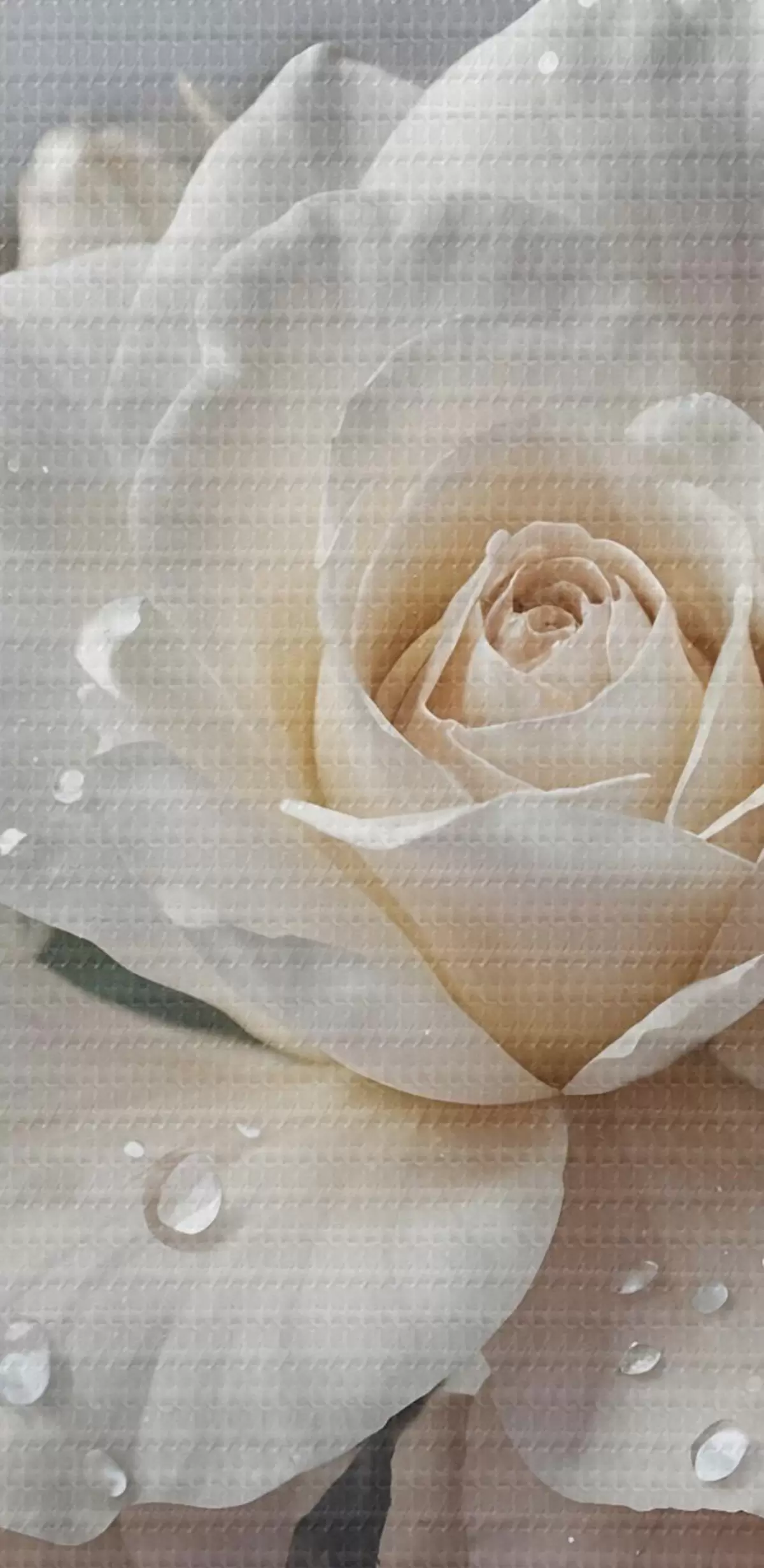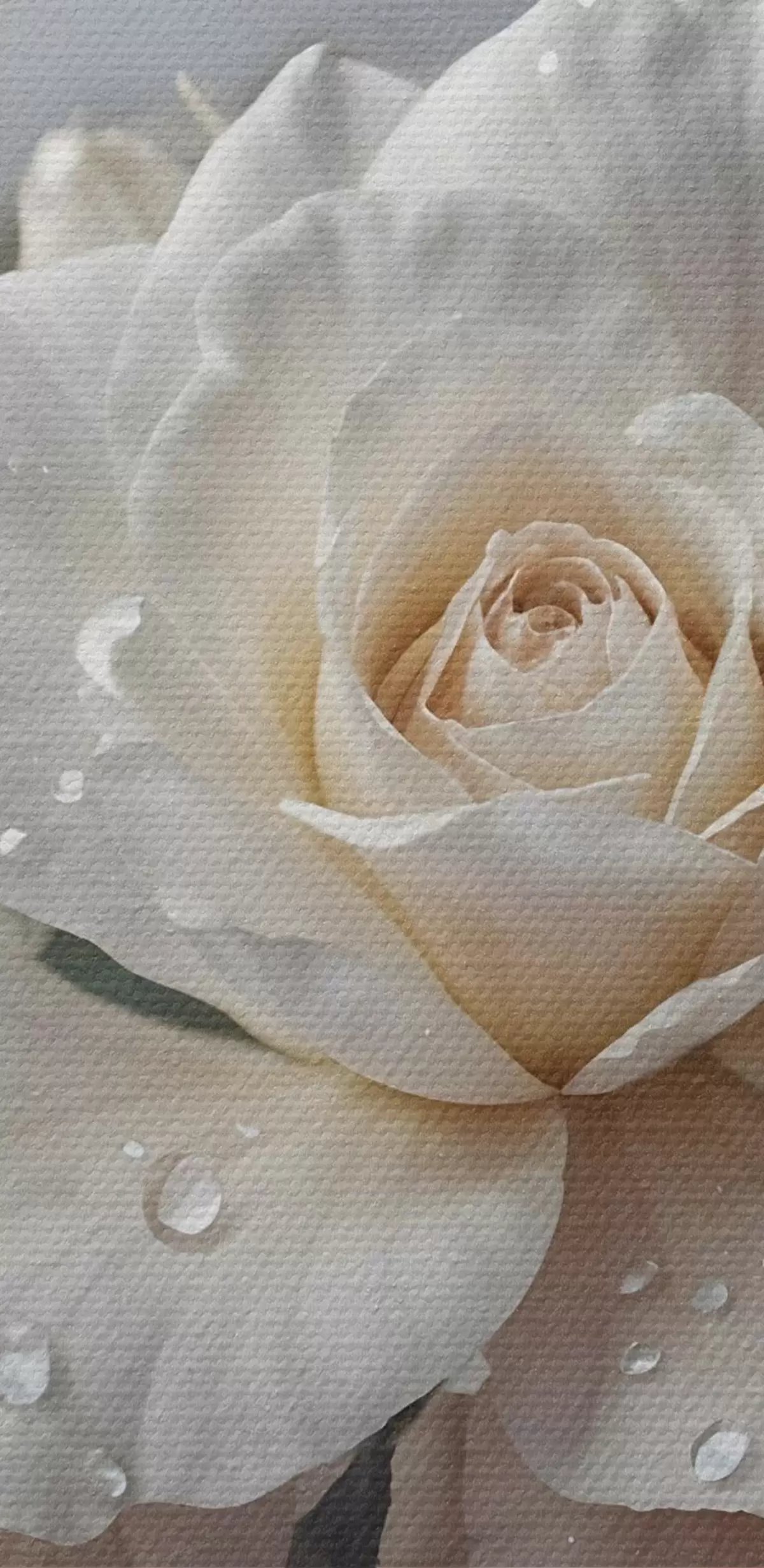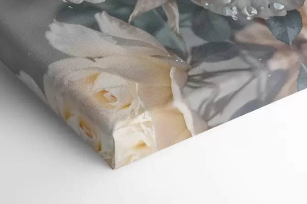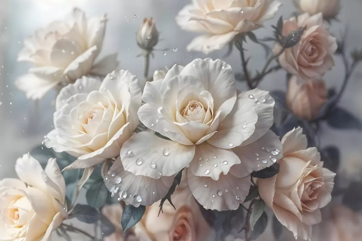 Glezna Baltu rožu grupa ar ūdens pilieniem uz ziedlapiņām, dažas zaļas lapas, pieklusināts fons, maiga gaisma Nr s43163