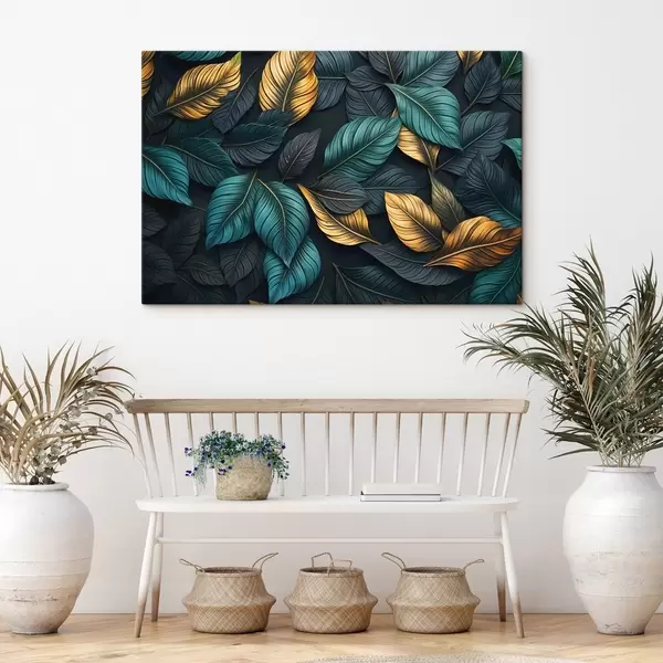 Glezna Tumši zaļas, dzeltenas un melnas lapas ar tumšām dzīslām, tumšā fonā, elegantā tropu noskaņā s43164