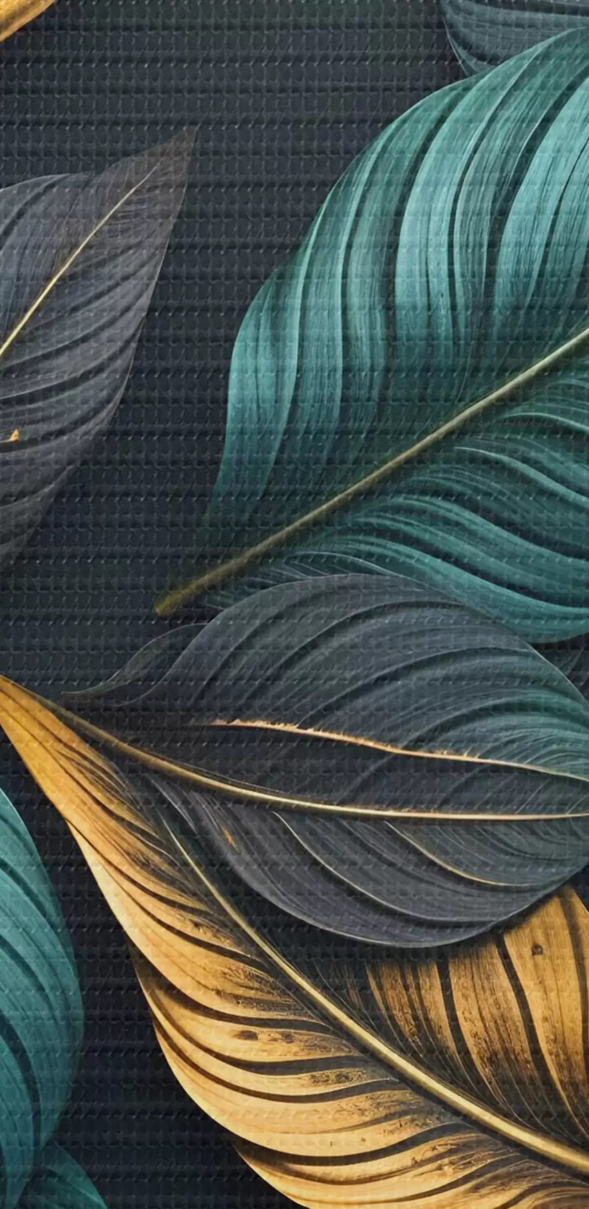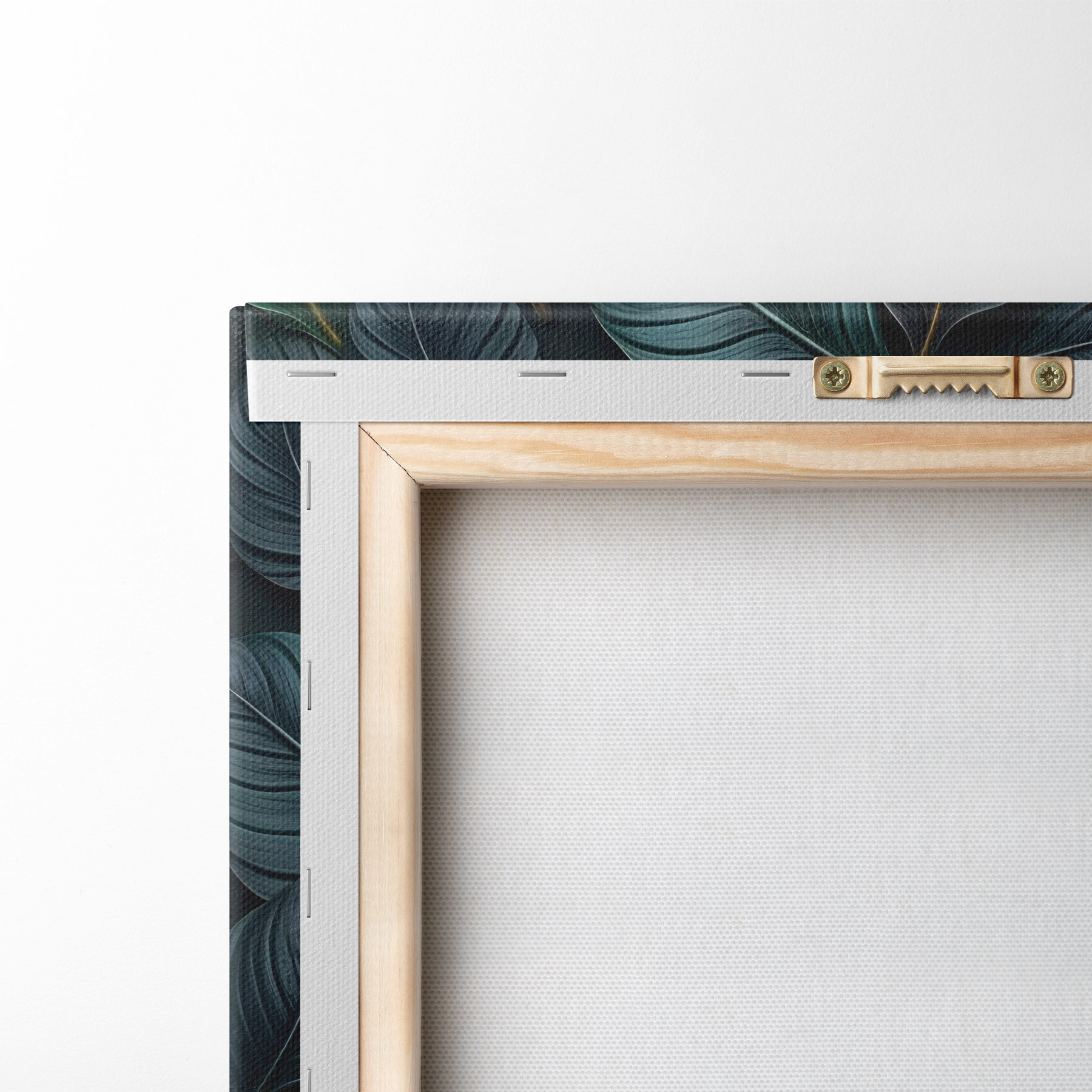Glezna Tumši zaļas, dzeltenas un melnas lapas ar tumšām dzīslām, tumšā fonā, elegantā tropu noskaņā Nr s43164