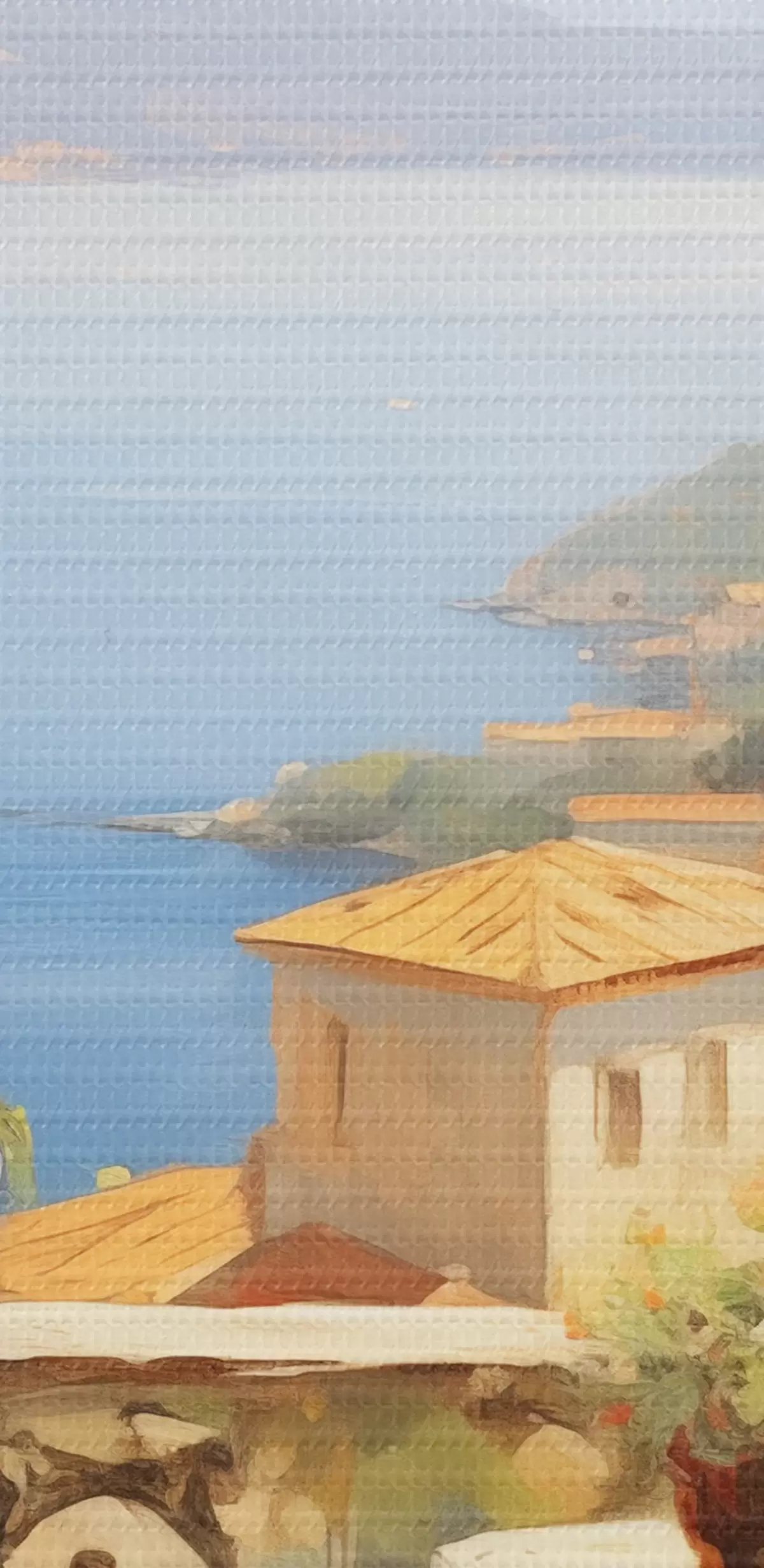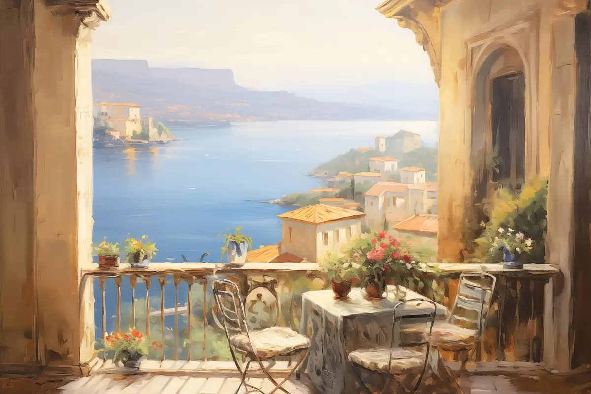 Glezna Eļļas glezna imitācija balkona ar ziediem, ar skatu uz jūru, mājas krastā, saulaina diena, zilas debesis s43173