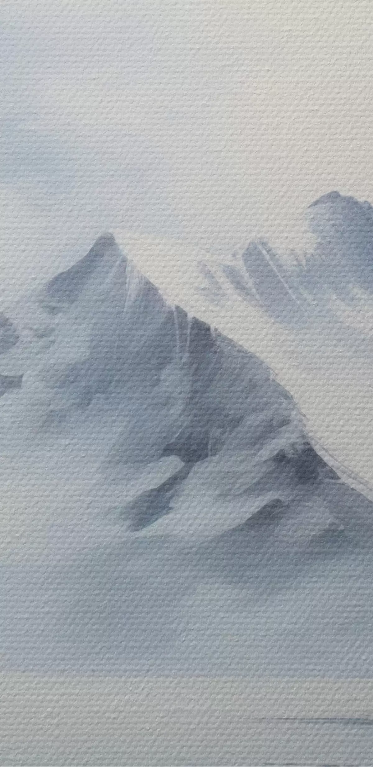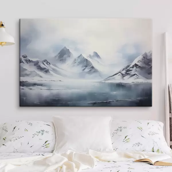 Glezna Sniegota kalnu ainava ar ezeru priekšplānā, virsotnes klāj sniegs un debesis ir apmākušās s43174