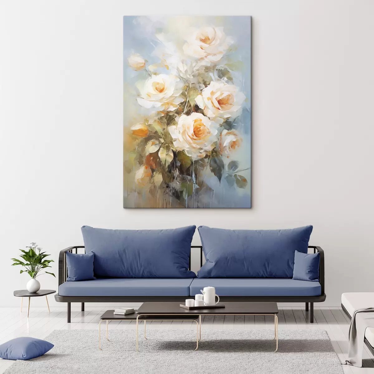 Glezna Baltas rozes ar oranžu krāsu uz maiga, gaiši zila fona, ar redzamiem otas triepieniem un glezniecisku stilu s43175