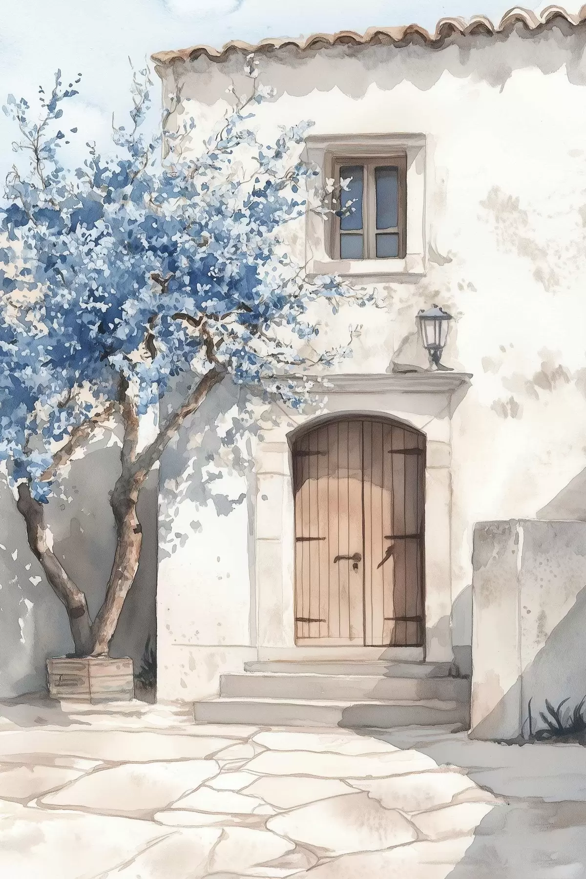 Glezna Grieķu māja ar skaistu koku, arhitektūra, akvareļu stils Nr s43178