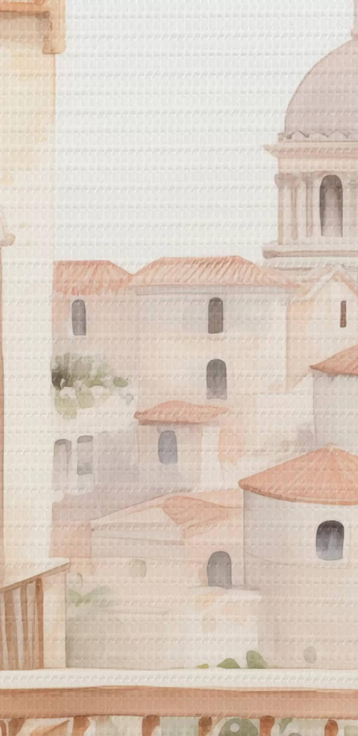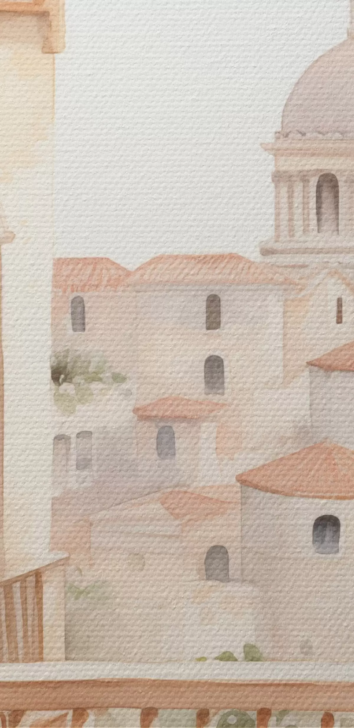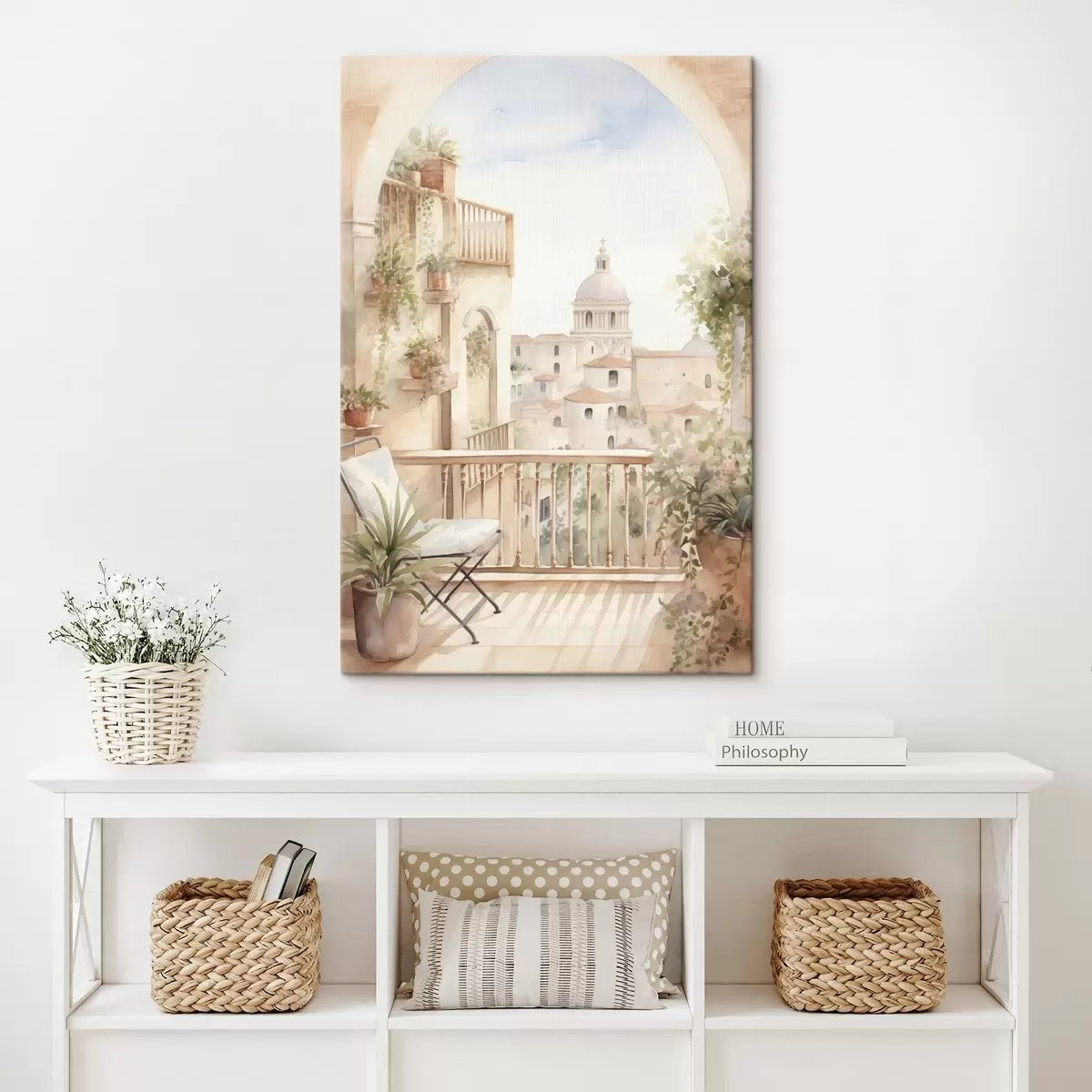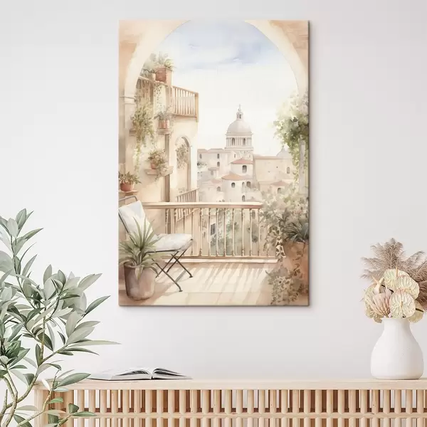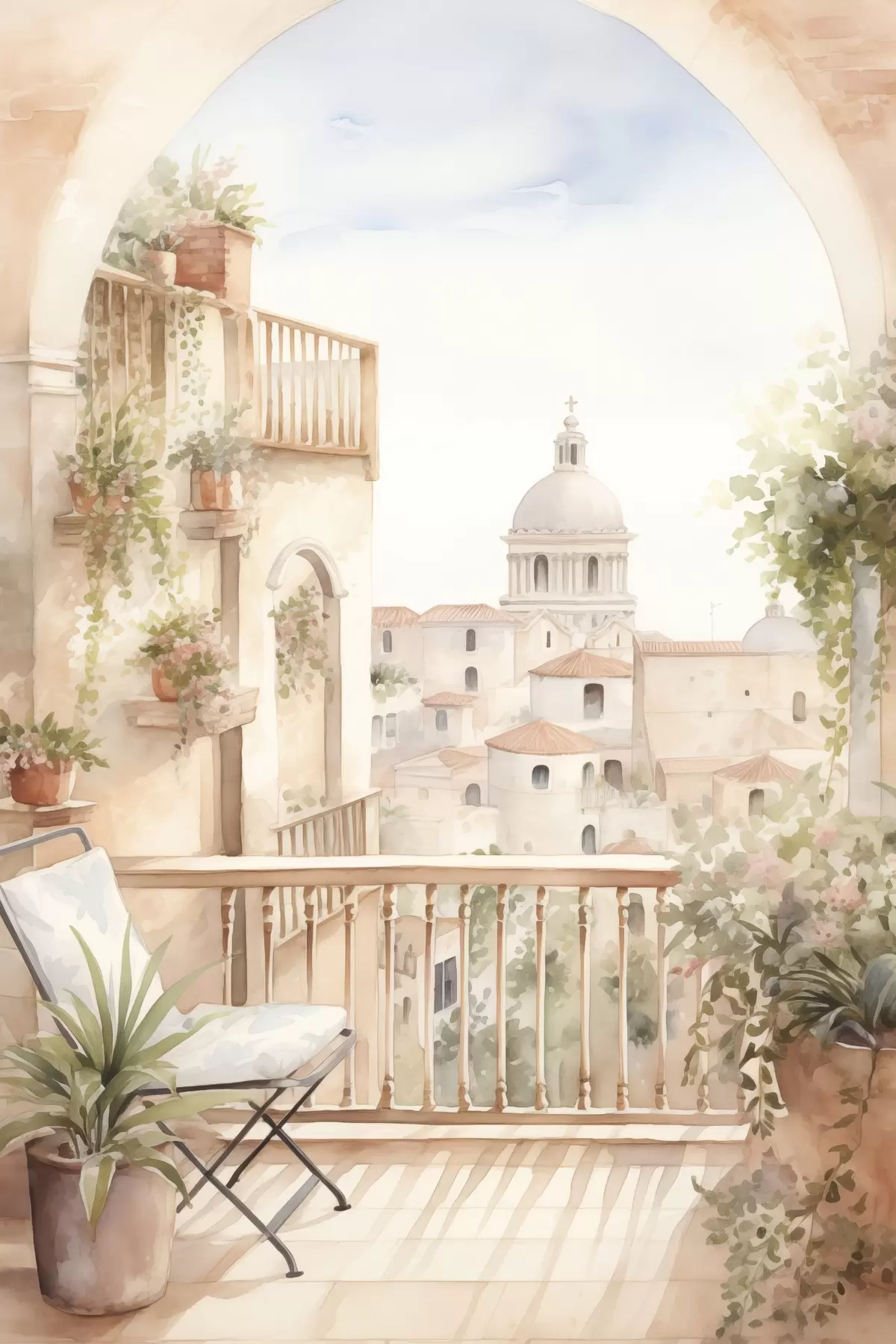 Glezna Estētisks vasaras balkons, Spānija, vecā arhitektūra, blomming, akvareļu stils s43180