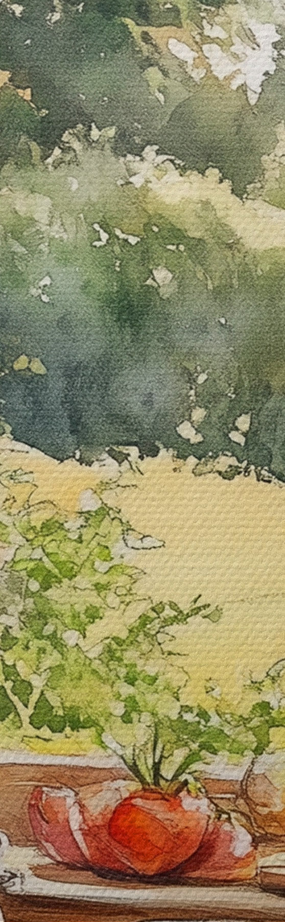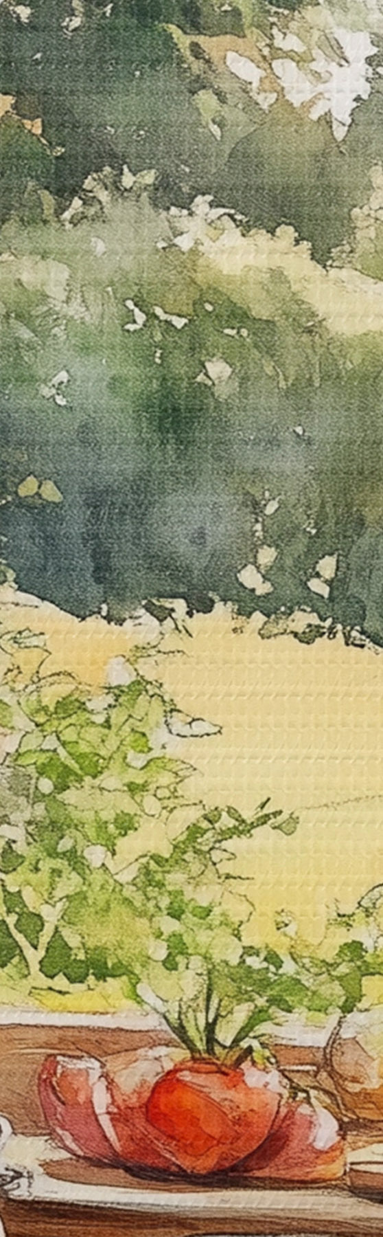 Glezna Ciemata estētika, koka māja, vasaras daba, dārzeņi, akvareļu stils s43185