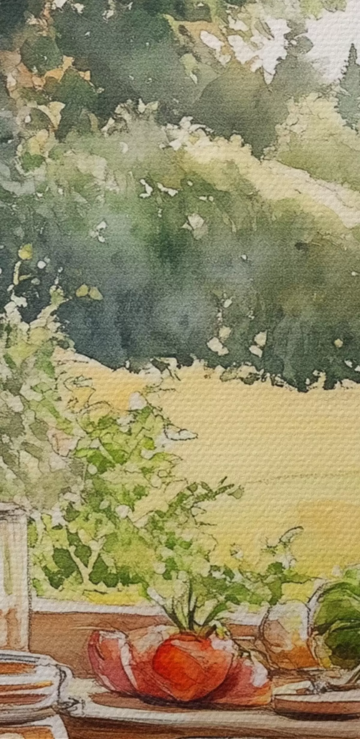 Glezna Ciemata estētika, koka māja, vasaras daba, dārzeņi, akvareļu stils s43185
